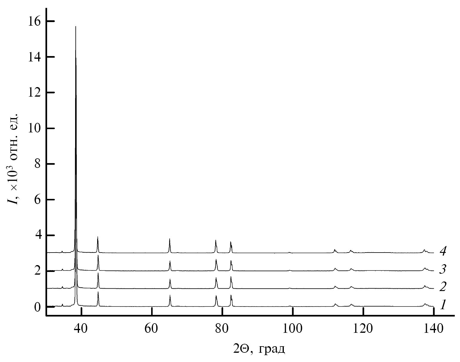 Рис. 1. Дифрактограммы САП-2 до (1) и после облучения МИП с плотностью тока 50 (2), 100 (3) и 150 (4) А/см2 тремя импульсами.