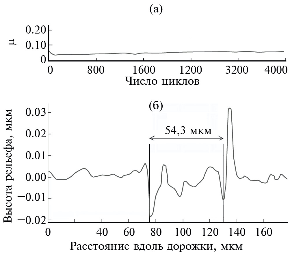 Рис. 2. Зависимость коэффициента трения скольжения покрытий от числа циклов при трибологических испытаниях образца 2 (а) и профиль дорожки трения после испытаний (б)