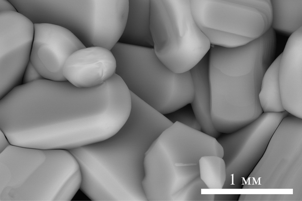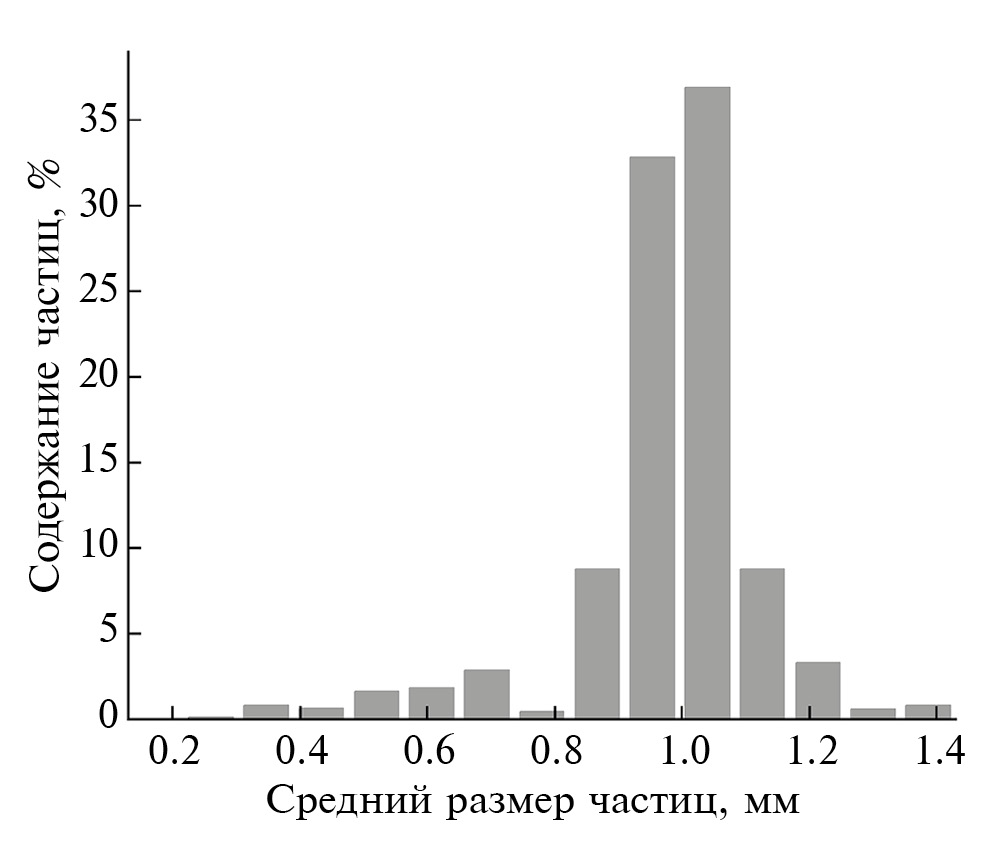 На рис. 2 представлен порошок после однократного размола стружки. Рентгенофазовый анализ порошка показал однофазный состав продукта помола – молибден с кубической объемно-центрированной решеткой типа α-Fe (a = 3.14 Å, Z = 2, пространственная группа Im3m). По данным энергодисперсионного анализа фракционный состав порошка содержит не менее (70 ± 3)% основной фракции с характерным размером частиц 1.0 ± 0.2 мм (рис. 3). На рис. 4 представлено изображение пылевой фракции осколочной формы, извлеченной из сепаратора. Отношение массы пылевой фракции к массе основного продукта помола составляет 1 : 9. При анализе энергодисперсионных спектров было обнаружено, что примесный состав по концентрации суммарно не превышает 500 млн–1 [15], что соответствует по чистоте марке молибденового порошка ПМ99,95, выпускаемого промышленностью.