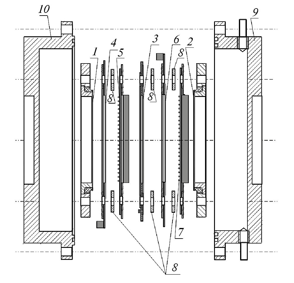 Рис. 1. Устройство позиционно-чувствительного детектора: 1 — первый слой конвертера из бора-10 на кремниевой подложке; 2 — второй слой конвертера из бора-10 на кремниевой подложке; 3 — рамка с анодными проволочками с базовым высоким напряжением питания; 4 — рамка с проволочками для измерения координаты X1; 5 — рамка с проволочками для измерения координаты Y1; 6 — рамка с проволочками для измерения координаты X2; 7 — рамка с проволочками для измерения координаты Y2; 8 — прокладочные шайбы; 9 — основание герметичного корпуса; 10 — крышка герметичного корпуса.