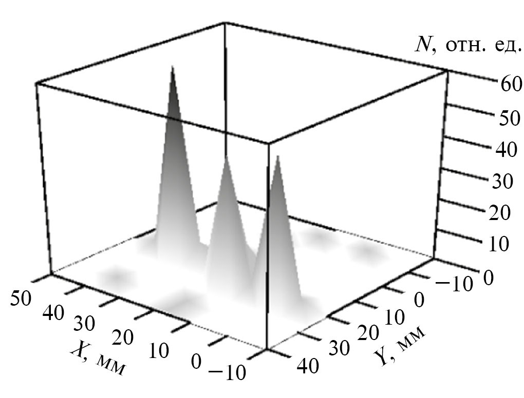 Рис. 2. Измеренное детектором размером 100 × 100 мм распределение потока нейтронов N на расстоянии 3 м от бериллиевой мишени из канала с маской из кадмия с тремя отверстиями диаметром 2 мм, расположенными на одной линии и находящимися на расстоянии 20 мм друг от друга.