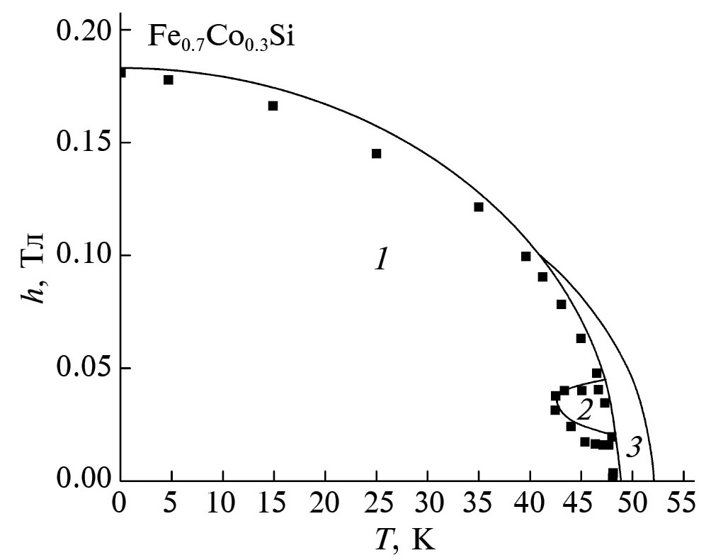 Границы (h1 и h2) этого интервала полей определяются уравнением: и отвечают возникновению спиновых конических структур (область 1 на рис. 2 и 3). Кроме того, численный анализ показывает, что за температурно-полевыми границами области существования скирмионной фазы и области с геликоидальным дальним порядком (область 1 на рис. 2 и 3) реализуется фаза флуктуации магнитного момента спиралей (область 3 на рис. 2 и 3), которые наблюдаются при исследованиях коротковолнового рассеяния поляризованных нейтронов [4, 23].