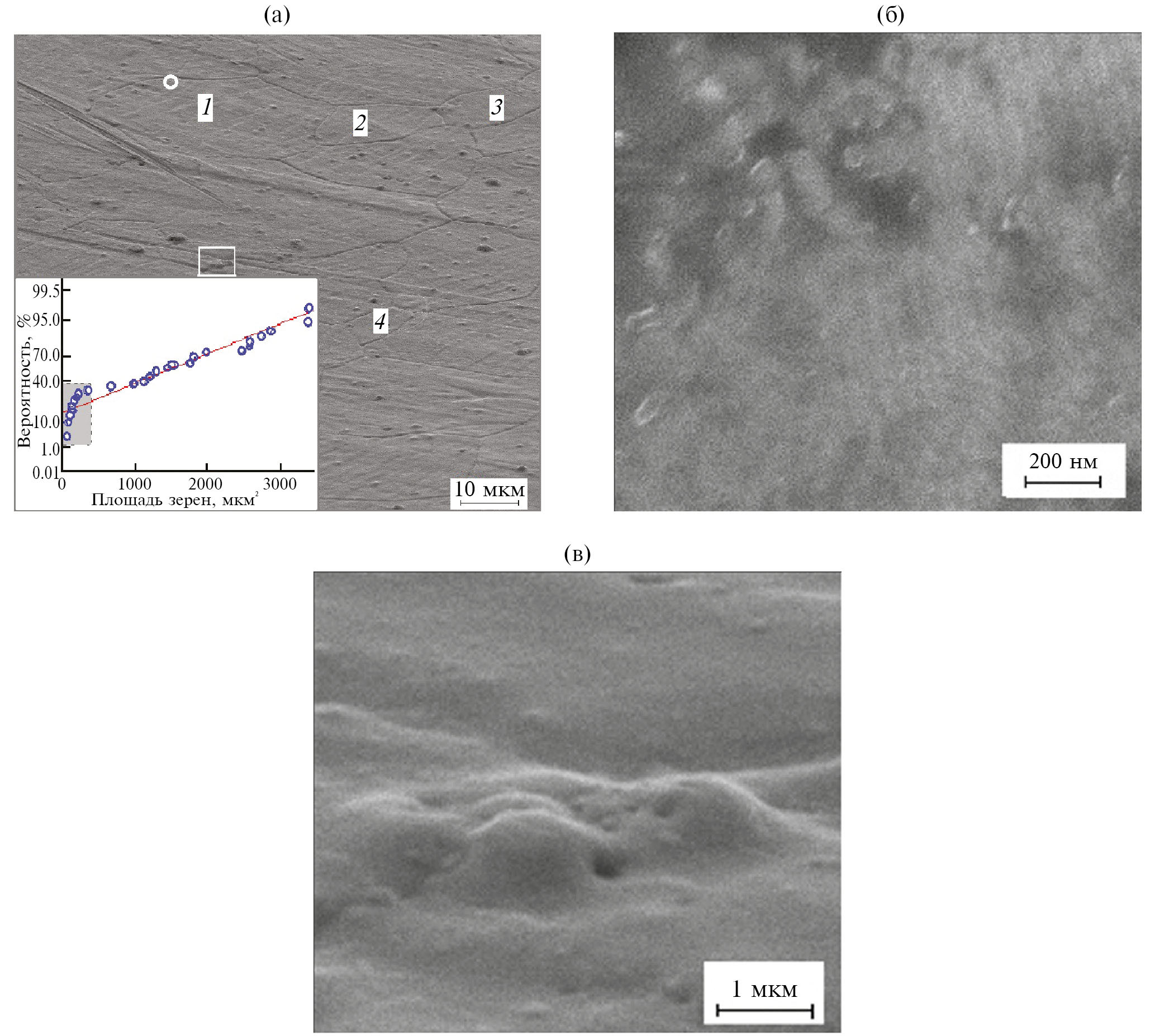 РЭМ-изображение на рис. 2а показывает бимодальное распределение размеров и формы зерен сплава: размеры зерна 1 превышают размеры зерен 2 и 3 практически в 3 раза, а зерна 4 — в 9 раз. На вставке в левом углу изображения показан расчет вероятности распределения зерен по размерам для площади поверхности 52749 мкм2. Размеры крупных зерен превышают размеры малых зерен от 3 до 8 раз. На графике выделена область, на которой видно, что зерна малого размера составляют 40% от общего числа. Подобное бимодальное распределение объясняет высокие показатели прочности сплава (табл. 1).