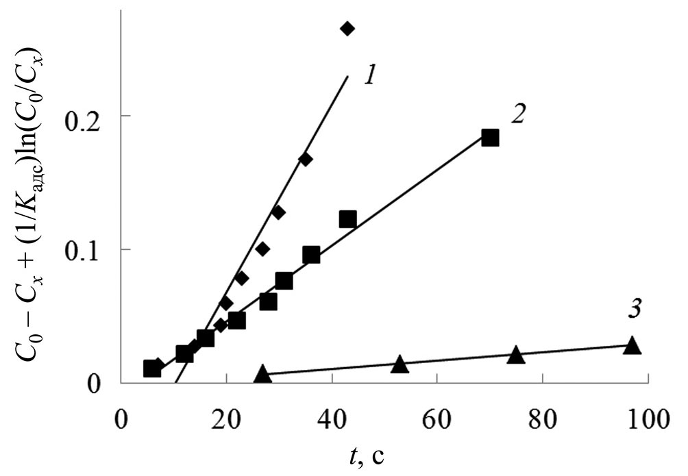 Анализ экспериментальных данных проводили с использованием кинетических моделей химических реакций нулевого (3), первого порядка (4) и модели Ленгмюра–Хиншельвуда (5):