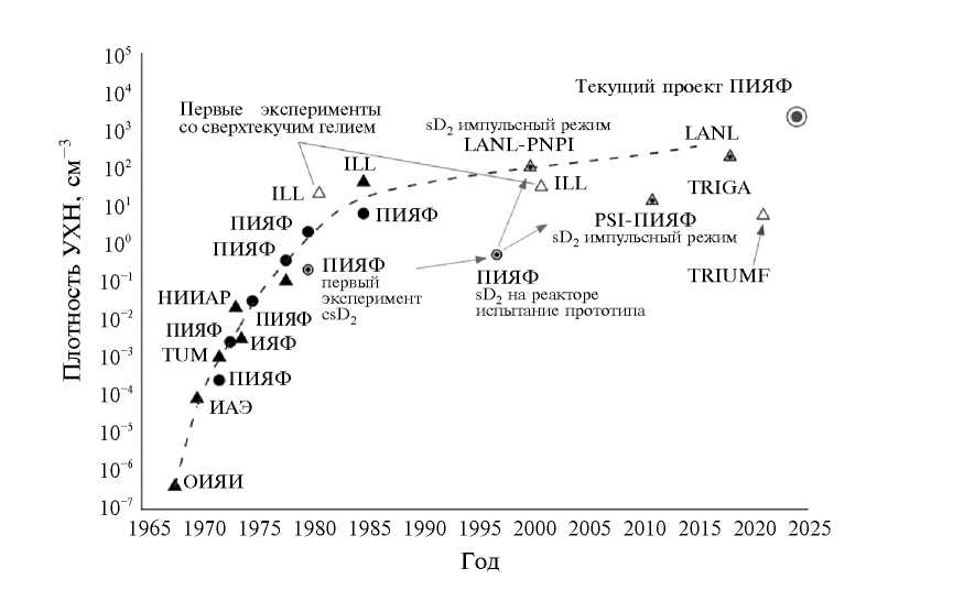 Работы по созданию источников ультрахолодных нейтронов на реакторе в НИЦ “Курчатовский институт” — ПИЯФ носили пионерский характер [4] и некоторые из них были защищены авторскими патентами [5, 6]. К 1985 году были использованы практически все возможности увеличения плотности УХН, так как источники были размещены в максимально возможном потоке тепловых нейтронов — в центре активной зоны на реакторе “ВВР-М” [7] и на высокопоточном реакторе в ILL [8] при температуре жидкого водорода и дейтерия. После успешных исследований начались активные попытки увеличить плотность УХН с использованием более низких температур. Однако использование очень низких температур и высоких нейтронных потоков находятся в очевидном противоречии. Тем не менее в настоящее время активно развивают два метода получения УХН при очень низких температурах: при температуре 4 К с использованием твердого дейтерия (s-D2) и при температуре 1 К с использованием сверхтекучего гелия 4He (на фазовой диаграмме [9] эти условия соответствуют области He-II). Общий прогресс развития источников УХН в мире представлен на рис. 1.
