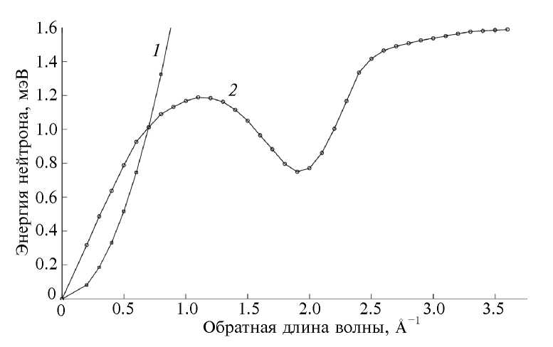 Рис. 2. Зависимости энергии возбуждения фонона (дисперсионые кривые) от волнового вектора в сверхтекучем гелии: для свободного нейтрона (1) и кривая Ландау (2).