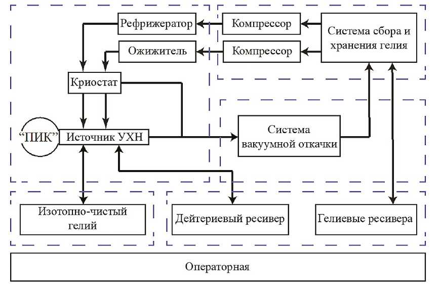 Для поддержания работы источника УХН потребовалось спроектировать большой и технологически сложный комплекс, который расположился в двух зданиях и на двух площадках. Принципиальная схема расположения частей этого комплекса приведена на рис. 4.