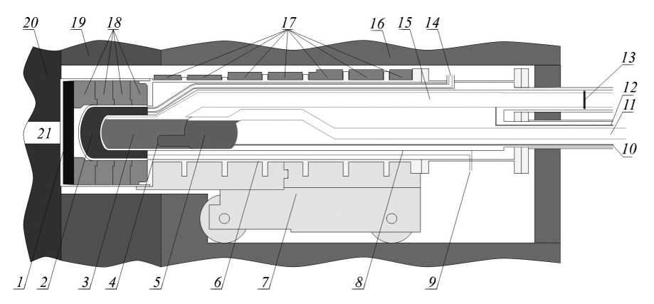 Центральной частью источника УХН является внутриказематная часть, в которой находится конвертер объемом 35 л со сверхтекучим гелием при температуре 1 К. Принципиальная схема внутриказематной части (в реальных пропорциях) представлена на рис. 6. В передней части внутриказематной чаcти источника УХН находятся свинцовый экран (1) для снижения теплопритоков к низкотемпературным конструкциям источника УХН от гамма-излучения, блоки графитового замедлителя (18), камера с жидкодейтериевым предзамедлителем (2) и камера со сверхтекучим гелием (3).