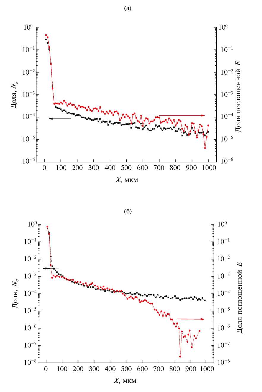 Рис. 5. Доля электронов Ne, энергия которых опустилась ниже порога прослеживания после взаимодействия с мишенью, и доля поглощенной мишенью энергии пучка E в зависимости от расстояния до облучаемой поверхности мишени X в приповерхностном слое толщиной 100 мкм образцов из стали (а) и вольфрама (б).