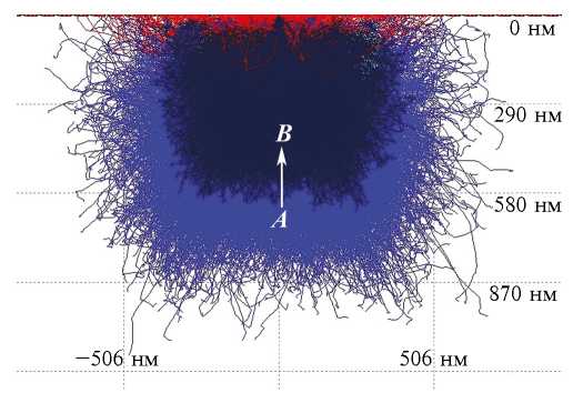 Рассмотрим теперь конфигурацию зарядов, образующихся под проводящей пленкой. На рис. 2 представлена полученная моделированием методом Монте-Карло (по программе Casino v2.5 [24]) область взаимодействия электронов с кварцевым стеклом до интенсивного процесса зарядки с энергией 8.4 кэВ и с EL = 8.4 — eVS2 ≈ 6.7 кэВ. Таким образом, максимальная глубина проникновения электронного пучка вследствие внутреннего эффекта зарядки уменьшается от ~870 нм (область А) до ~580 нм (область B). Также происходит небольшое сжатие области взаимодействия и в латеральном направлении.