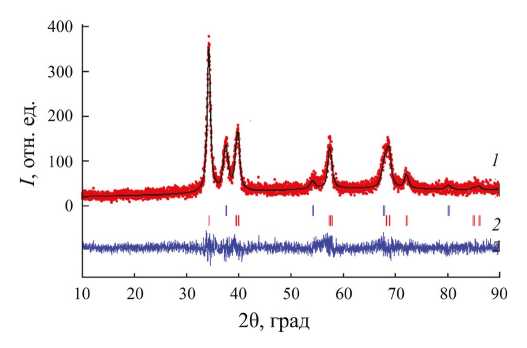 Рис. 2. Дифрактограмма образца гидридной фазы на основе TiZrNbMoTa с количеством водорода 0.9 атомов на атом металла решетки, обработанная методом Ритвельда: экспериментальный (точки) и расчетный профили (сплошная линия) (1); разность между ними (2). Штрихи соответствуют брэгговским позициям: верхний ряд — гидридная фаза с кубической решеткой, нижний ряд — с тетрагональной решеткой.