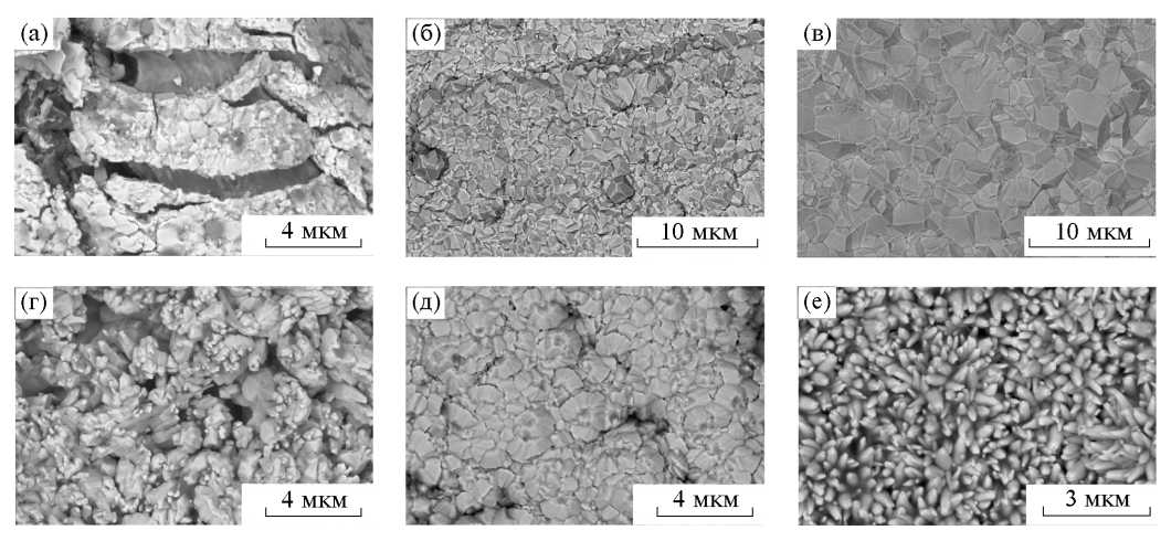 Рис. 1. РЭМ-изображения танталовых покрытий, полученных химическим газофазным осаждением при 800°C и высокой (a), средней (б) и низкой (в) концентрации гелия y, при низкой y и 750 (г), 700 (д) и 650°C (е).