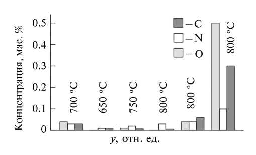 Рис. 2. Содержание углерода, азота и кислорода в танталовых покрытиях, полученных химическим газофазным осаждением при различной температуре и концентрации гелия y. Относительные погрешности определения концентраций не превышают 20%.