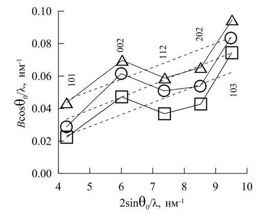 Рис. 5. Построение Вильямсона–Холла для ОЦК-тантала, полученного химическим газофазным осаждением при 800°C и средней концентрации гелия y (□), 750°C и низкой y (○), 800°C и низкой y (£). Погрешности на графике не превышают размеров точек.
