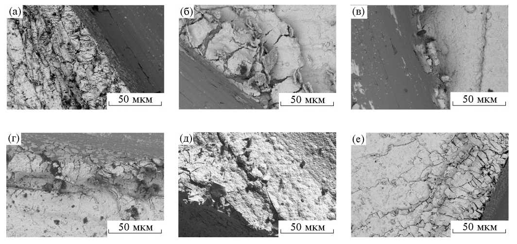 Рис. 6. Тест царапанием танталовых покрытий, полученных химическим газофазным осаждением при 800°C и высокой (a), средней (б) и низкой (в) концентрации гелия y, при низкой y и 750 (г), 700 (д) и 650°C (е).
