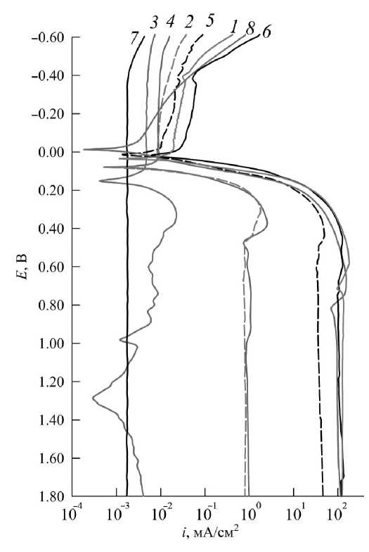 Рис. 7. Поляризационные кривые танталовых покрытий, полученных химическим газофазным осаждением при 800°C и высокой (1), средней (2) и низкой (3) концентрации гелия y, при низкой y и 750 (4), 700 (5) и 650°C (6), а также тантала (7) и медной подложки без покрытия (8). Среда съемки — 0.5 M H2SO4.