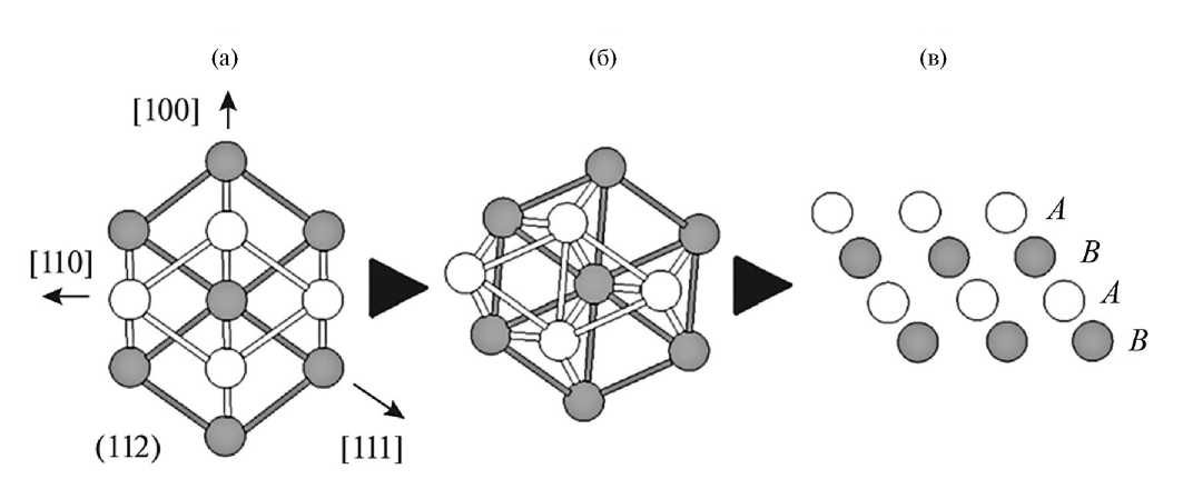 Рис. 9. Схема механизма фазового превращения ОЦК → ГПУ: a — проекция исходной структуры с ОЦК-решеткой на плоскость (112); б — структура, измененная за счет дефекта упаковки на плоскости (112), а также сжатия в направлении [100] с одновременным растяжением вдоль направления [110]; в — структура результирующей ГПУ-фазы.