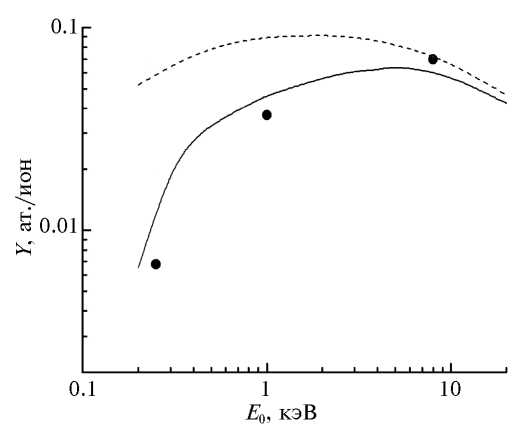 Рис. 1. Полные коэффициенты распыления WC в зависимости от энергии ионов гелия (нормальное падение), расчет: сплошная линия — стехиометрическое распыление измененного слоя; штриховая линия — без образования измененного слоя; символы — эксперимент [21].