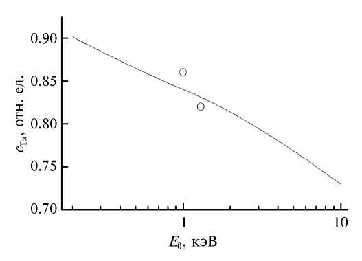 Рис. 6. Результаты расчетов относительной концентрации тантала в измененном слое при стационарном распылении TaC ионами He в зависимости от энергии ионов (нормальное падение): сплошная линия — расчет; символы — эксперимент [22].