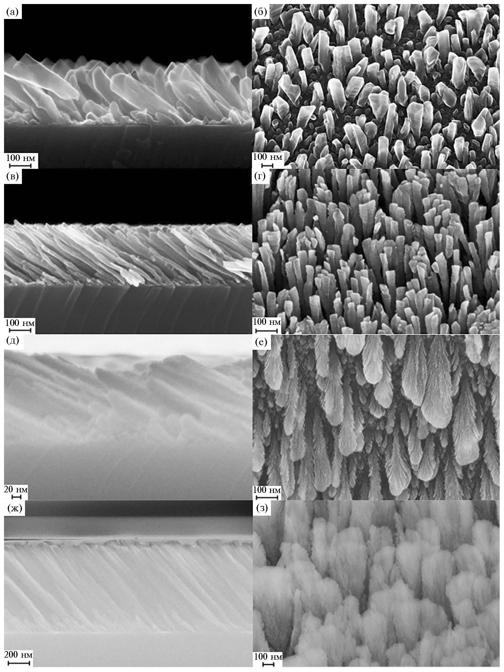 Рис. 2. РЭМ-изображения пленок разного состава (поперечный срез (а, в, д, ж) и вид сверху (б, г, е, з)): а, б — Al; в, г, — Co; д, е — Ge; ж, з — SiO2. Все пленки получены при оптимальном угле наклона 85°.