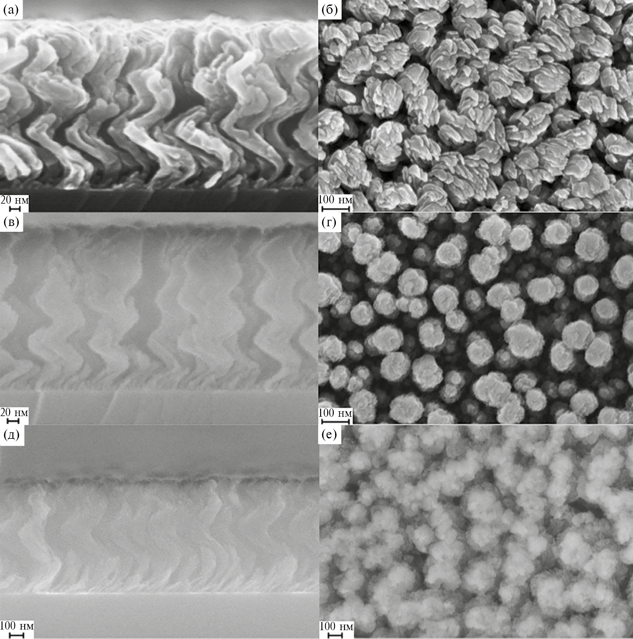 Рис. 4. РЭМ-изображения пленок разного состава (поперечный срез (а, в, д) и вид сверху (б, г, е)): а, б — Co; в, г — Ge; д, е — SiO2. Все пленки получены при оптимальном угле наклона 85° и скорости вращения подложки 0.6 об./мин.