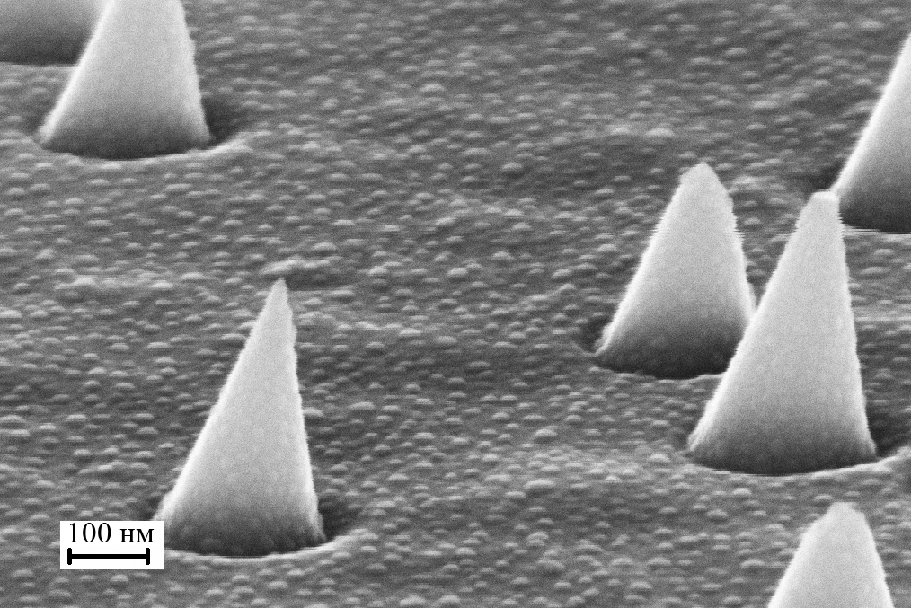 Рис. 1. РЭМ-изображение ступени травления на примере монокристаллической пленки PbSe (111). Угол наклона образца при съемке 70°.