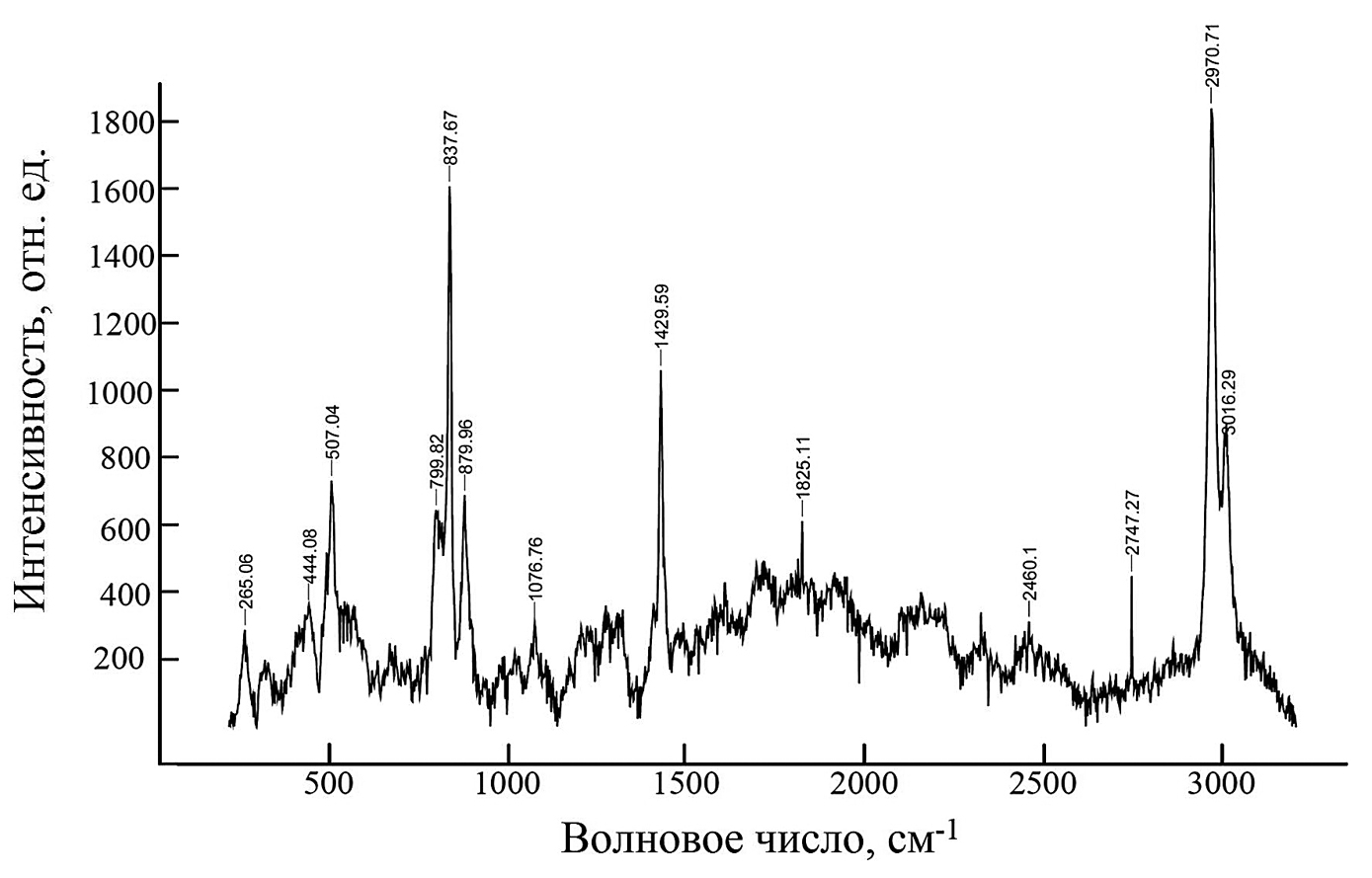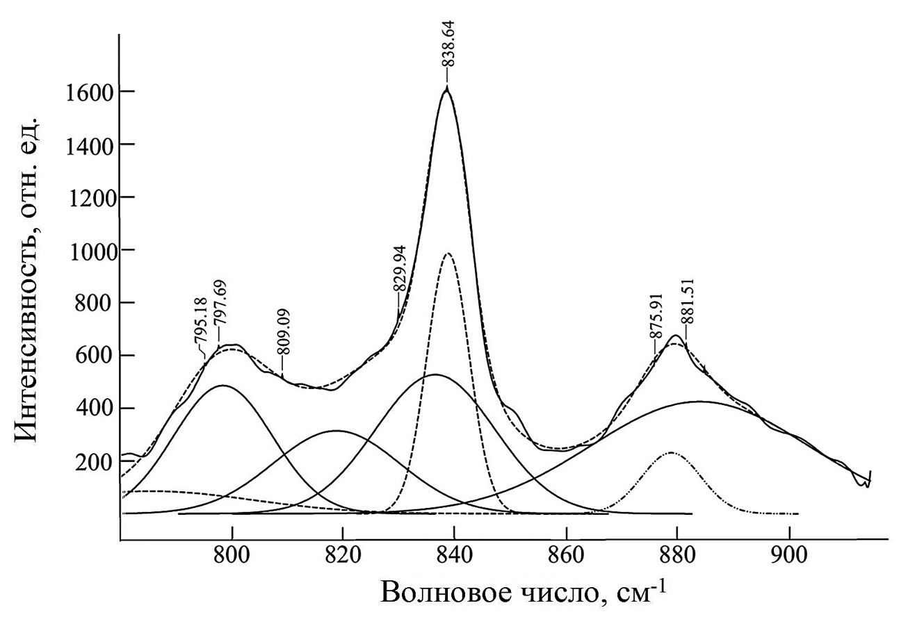 ПВДФ широко исследовали методами спектроскопии КРС [22–29]. В табл. 2 отражены основные фононные моды ПВДФ в диапазоне 200–3000 см–1 [27–30]. Данные таблицы позволяют определить индивидуальные аналитические полосы для кристаллической α-фазы — это область в районе 800 см–1. Для остальных форм “чистых” аналитических полос нет. Если в спектре КРС преобладает полоса при 839 см–1, которая является общей для β- и γ-фаз, то очень сильной она становится только для β-фазы. Более того, появление характерной для γ-формы слабой полосы при 811 см–1 указывает на присутствие значительного количества последовательностей T3GT3G′, т.е. γ-фаз. Очень сильная полоса при 795 см–1 для α-фазы наблюдается только в виде плеча. Оно показывает, что последовательности TGTG, не обладающие дипольным моментом и не являющимися полярными, дают очень незначительный вклад в полимерную структуру.