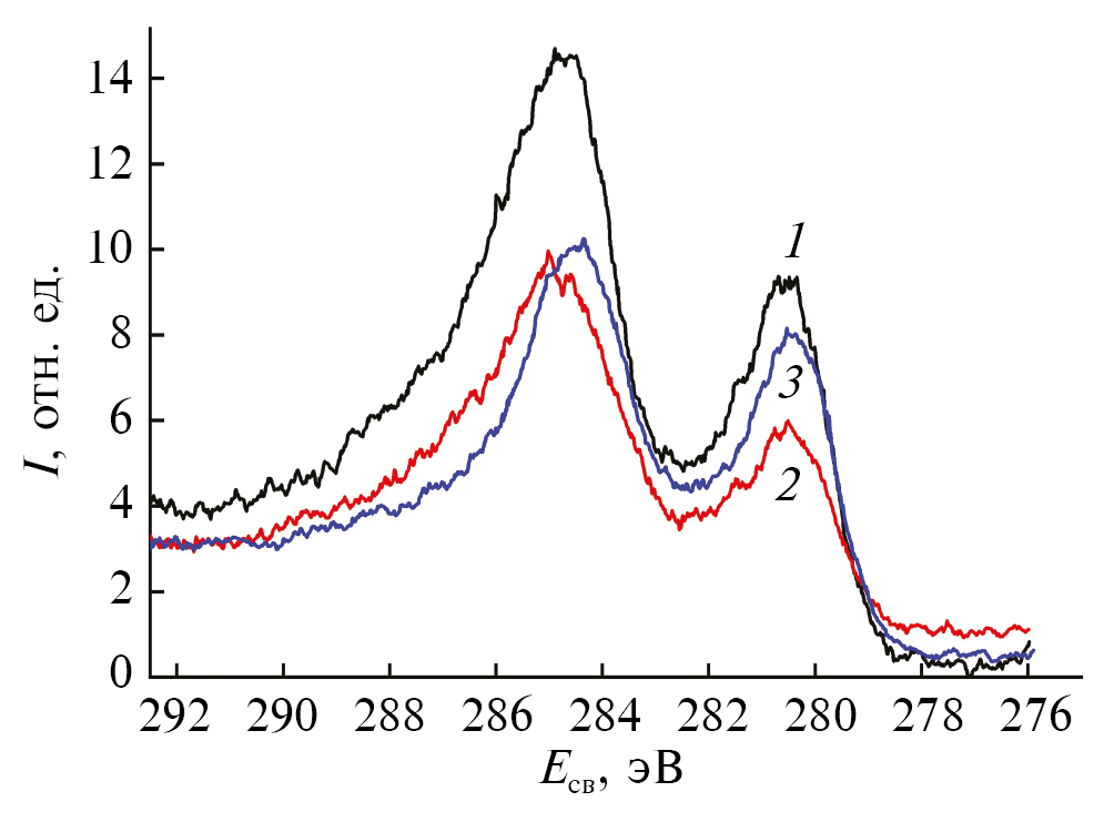 С увеличением энергии бомбардирующих ионов от 40 до 150 эВ вид спектров Ru3d сильно изменяется (рис. 4). Ширина пика Ru3d3/2 увеличивается, однако высота пиков Ru3d5/2 изменяется немонотонно. Наиболее резко максимум пика Ru3d3/2 возрастает при энергии 150 эВ, но он не сдвигается. В обоих случаях бомбардировки ионами максимумы пиков наблюдаются при одной энергии ~284.5 эВ. Максимумы пиков Ru3d5/2 также наблюдались при одинаковой энергии ~ 280.5 эВ.