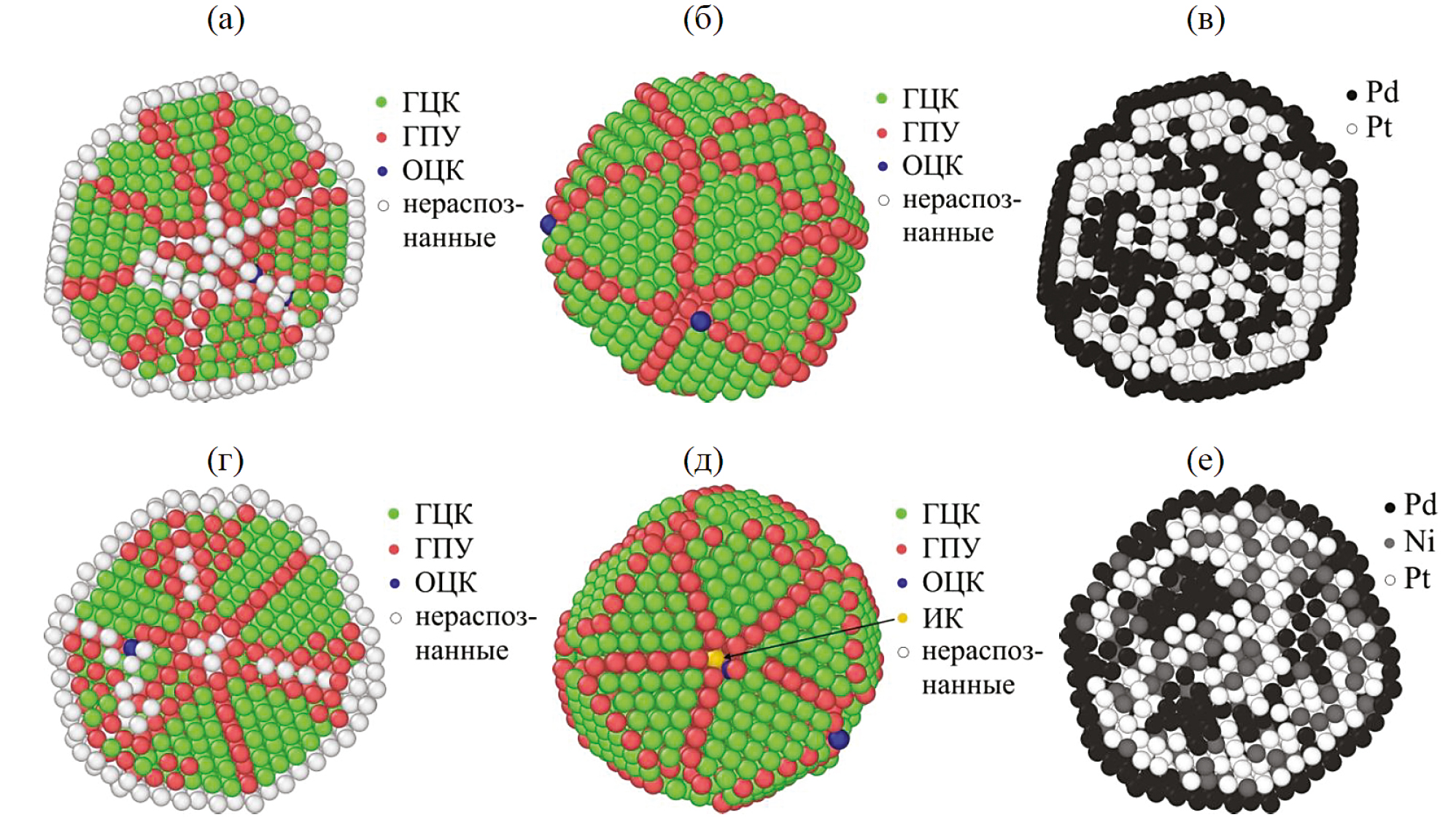 Сравнивая рис. 2в и 2е, можно заключить, что допирование бинарных наночастиц Pt–Pd атомами Ni практически не повлияло на сегрегацию основных компонентов, т.е. Pt и Pd: в обоих случаях наружный монослой представлен атомами Pd. Отдельные атомы Ni и их малые нанокластеры равномерно распределены по объему наночастицы (рис. 2е), т.е. атомы Ni не демонстрируют тенденции к их концентрации в центральной области наночастицы или на ее поверхности.