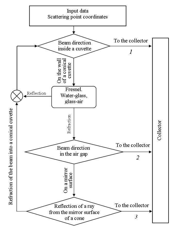 To avoid multiple duplication of low-intensity rays, it was assumed that light reflected in the direction of a quartz cone cuvette penetrates the medium with a transmittance equal to unity. The relative error of this simplification is estimated at 5%. Further calculation of the Fresnel coefficients for such rays was carried out according to a simplified scheme, namely: a ray of greater intensity was selected from the reflected and refracted ray. The corresponding Fresnel coefficient was set to unity. For a given scattering angle, integration over two spatial coordinates and azimuth was carried out. Light losses in this scheme can only be associated with the ray reflection in the direction of the light source and with the absorption of light during specular reflection from the external cone mirror reflector.