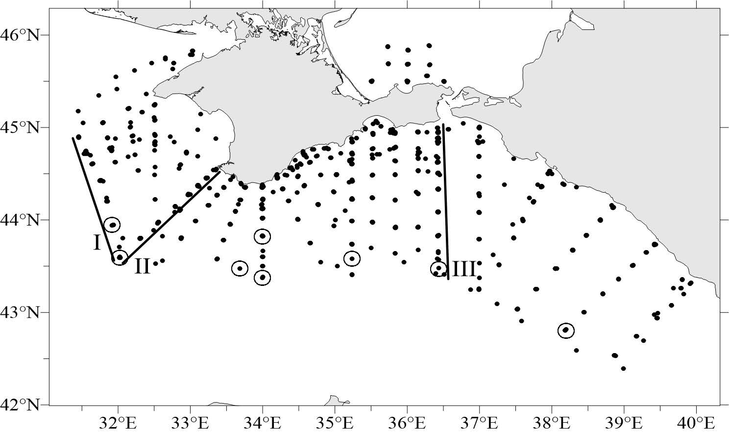 F i g. 1. Map of the deep-sea stations at which the samples for oxygen and hydrogen sulfide were taken in 2017–2019. Solid lines indicate sections I-III which were carried out in each cruise if possible. Circles indicate the stations where samples were taken at 37 horizons.