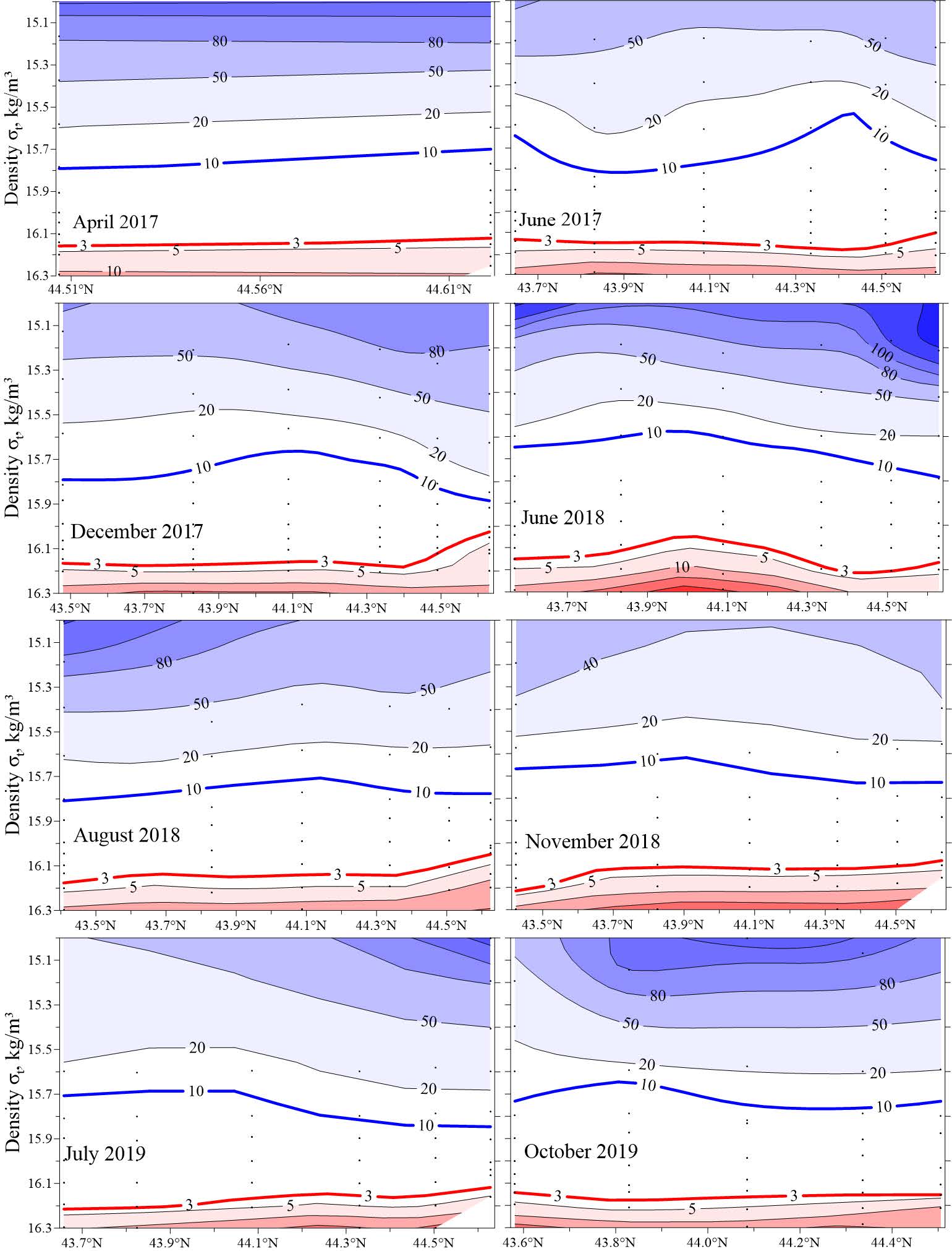 - The position of the sub-oxygen zone upper boundary determined by isooxygen 10 μM was not strictly isopycnal, but within isopycnal interval σt = 15.7–15.85 kg/m3. The deepest location of the upper boundary below σt = 15.8 kg/m3 was observed in November and December 2017, as well as in August 2018.