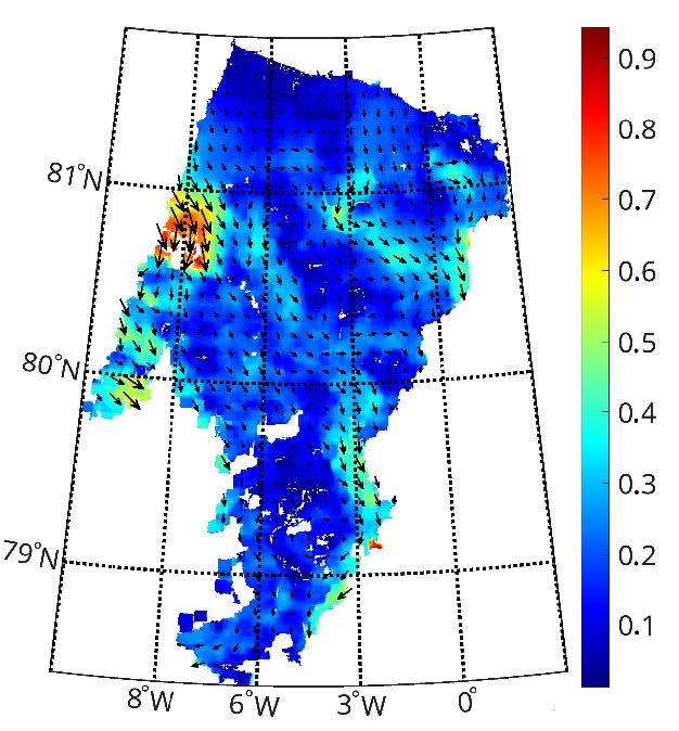 F i g. 4. Final result of calculation of the ice drift velocity (m/s) field in the Fram Strait for 26 July 2018