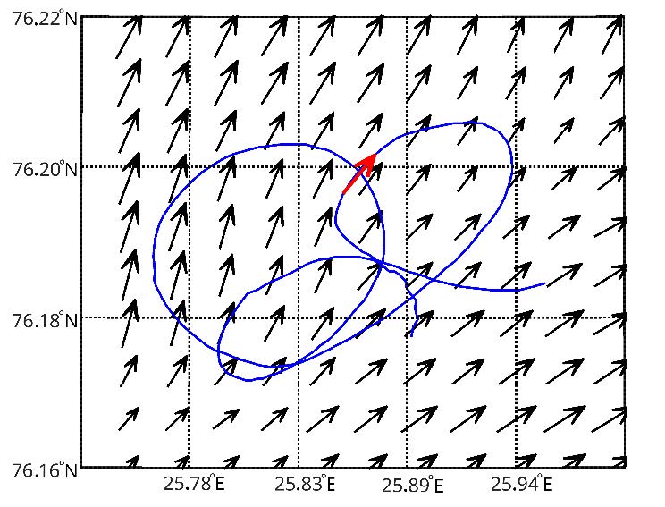 An objective evaluation of the described approach effectiveness is difficult due to the lack of reference data on surface sea dynamics. The most promising approach in the present case seems to be a comparison of the velocity fields modelled from satellite data with field data on the direction and speed of the ice drift obtained based on the stationary geolocation sensors (GPS trackers) installed on ice floes. Figure 5 shows the drift trajectory of such a sensor against the velocity field background calculated from satellite data.