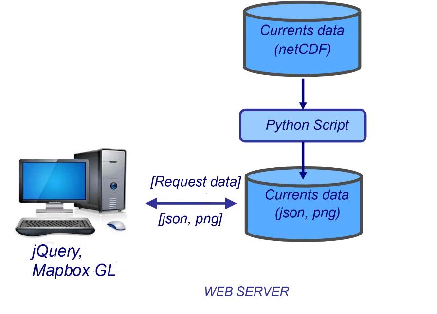 At the next stage, the products with sea ice drift velocity fields simulated from quasisynchronous satellite data are posted on the webpage of Laboratory of Marine Polar Research (LMPR) of Marine Hydrophysical Institute of RAS at http://polar-space.ru/arctic_currents. To do this, the calculated fields are first interpolated onto a grid with a 40 m step and recorded as netCDF files. A data visualization system based on client-server architecture was developed for the Web. Figure 6 shows the general structure of the visualization system for this satellite product.
