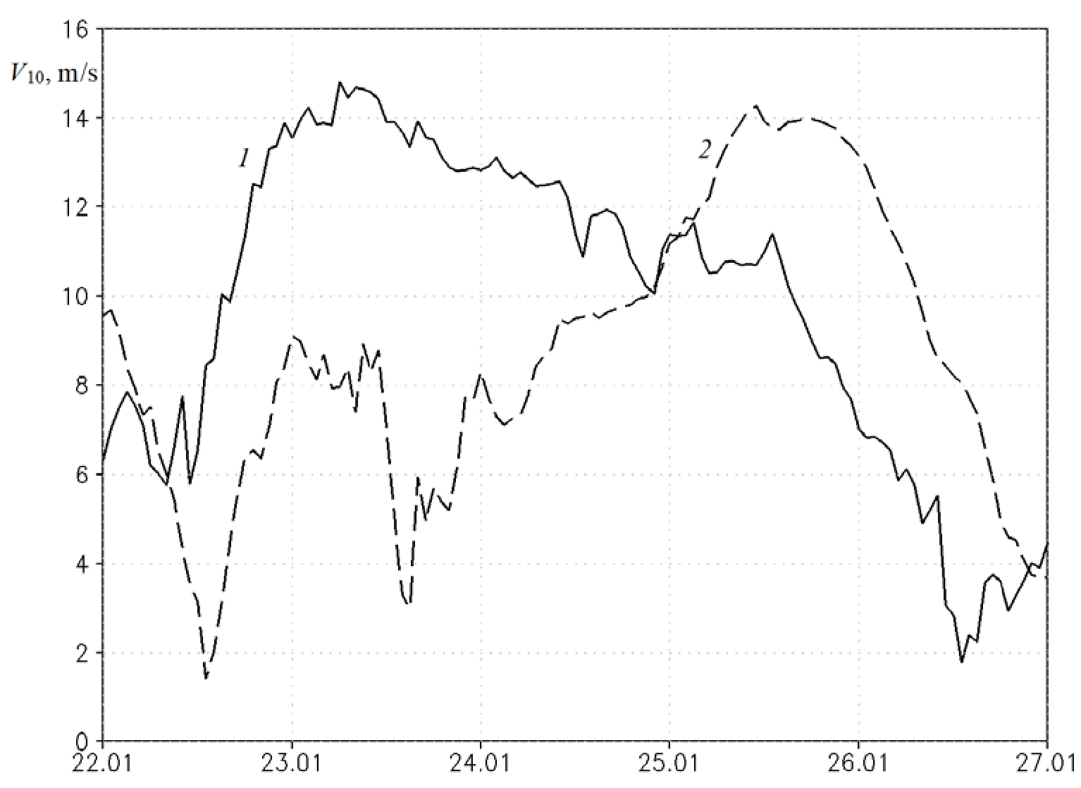 F i g. 1. Surface wind speed, m/s, at the points with coordinates 31°E, 44.5°N (1) and 37.5°E, 43°N (2) in January 22–26, 2010. The point positions are shown in Fig. 2