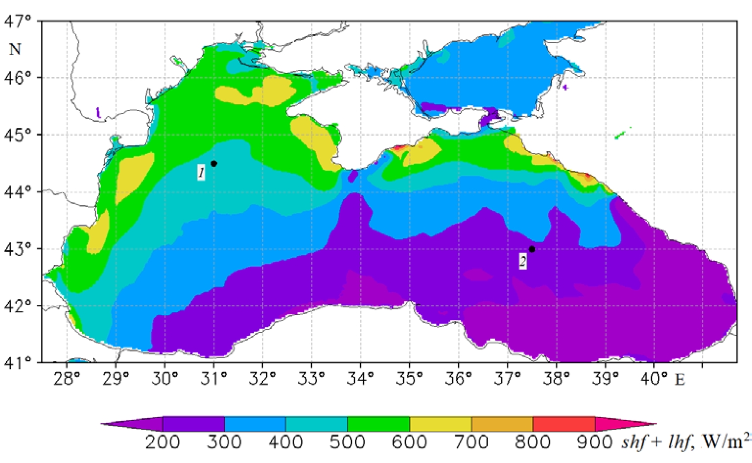 Fig. 1 shows wind speed values at a height of 10 m at two points in the northwestern and eastern parts of the sea. Fig. 2 demonstrates total heat flux from the surface averaged over the cold intrusion (January 23–25), shf + lhf. It is clearly seen that for the entire sea the episode under consideration can indeed be considered a three-day cold air intrusion. During this period, the sea cooling was heterogeneous: the western and eastern halves of the sea are separated by a small area of reduced fluxes which is naturally explained by a wind speed decrease behind the leeward slope of rather high Crimean Mountains [13]. At the same time, heat loss from the surface in the northern part of the sea was 500–600 W/m2, wind speed was about 10–14 m/s. In the southern half of the sea, heat loss through the surface is smaller than in the northern half since cold air warmed up when moving above a warmer sea.