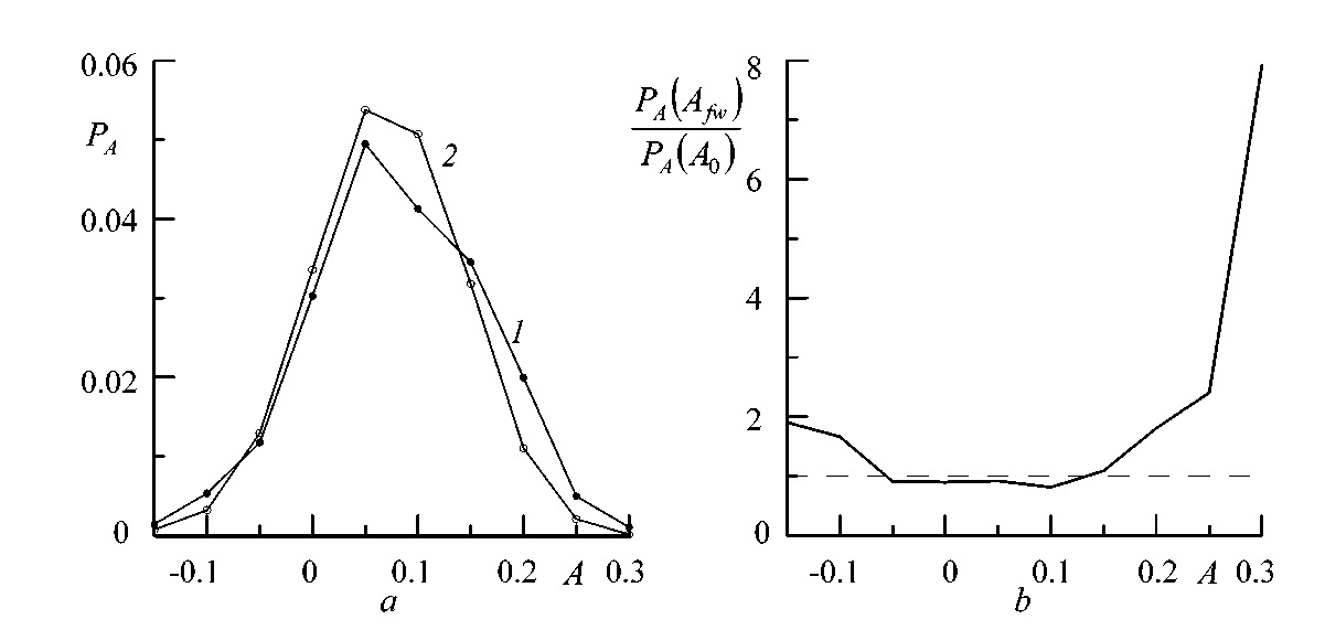 It is natural to assume that the occurrence of negative skewness values is statistically related to the ratio . Let us consider two arrays of wave measurement data. The first array includes all data, the second – only the data obtained in the presence of freak waves. If the analysis is carried out for the entire range of AI variations, then the relationship between A and is not observed (Fig. 3, a) and correlation coefficient ρ between these parameters is equal to – 0.1. Statistical relationship between A and occurs only when AI > 2 (Fig. 3, b) and correlation coefficient is for the second data array.