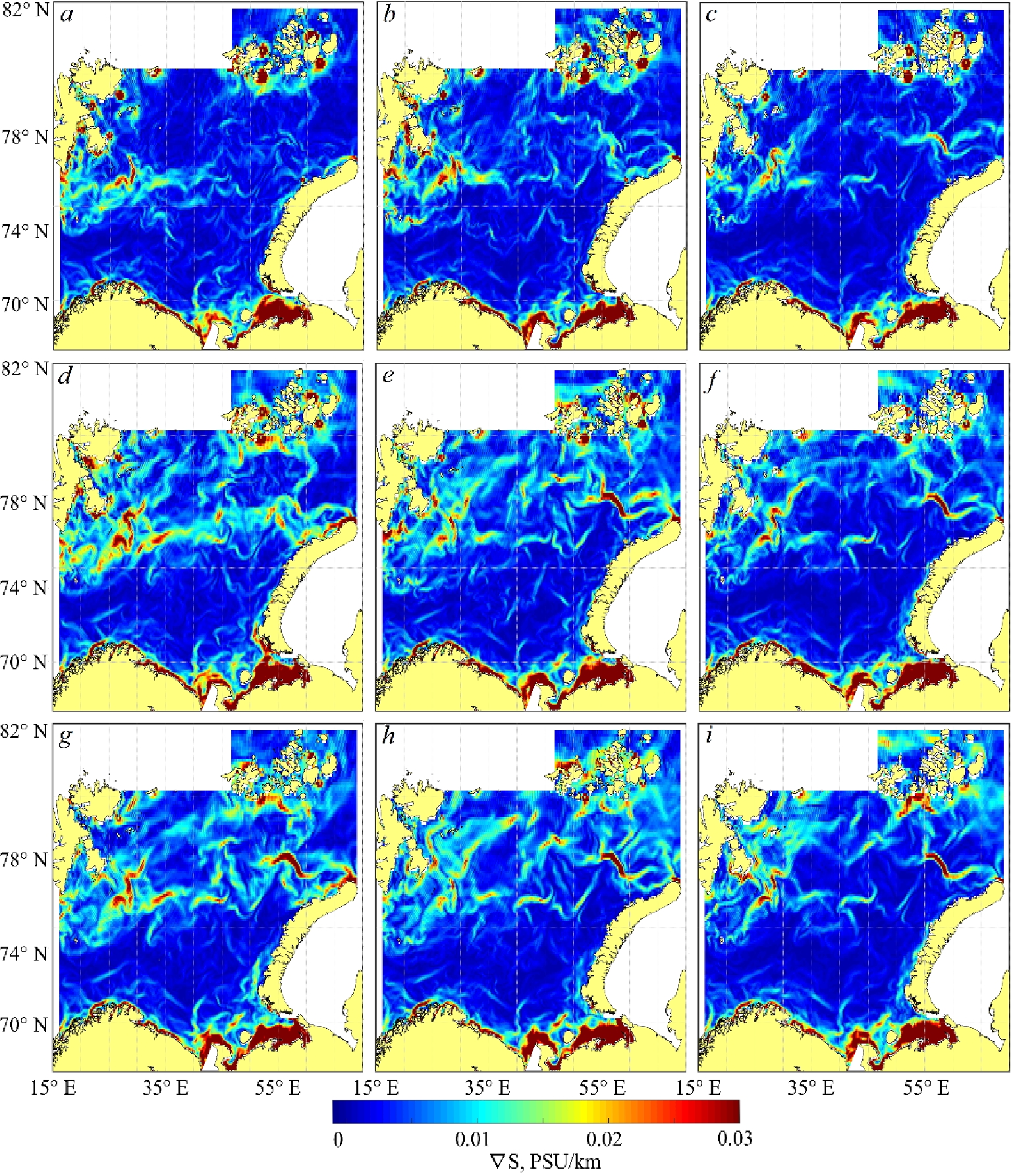 F i g. 5. Distribution of decadal horizontal salinity gradients in the Barents Sea based on the CMEMS GLORYS12v1 and MERCATOR PSY4QV3R1 data: in June (a, b, c), in July (d, e, f), in August (g, h, i), 1993–2002 (a, d, g), 2003–2012 (b, e, h), 2013–2022 (c, f, i)