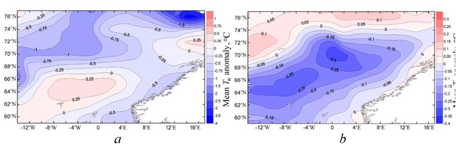 In the Barents Sea, a negative sea surface temperature anomaly with the coldest waters located in its southern and eastern regions was observed during the decade of NAO index negative values (Fig. 9, a). Colder waters occupied the eastern and western peripheries of the sea and warmer waters occupied the central part of the Barents Sea in the decade of NAO index positive values (Fig. 9, b).