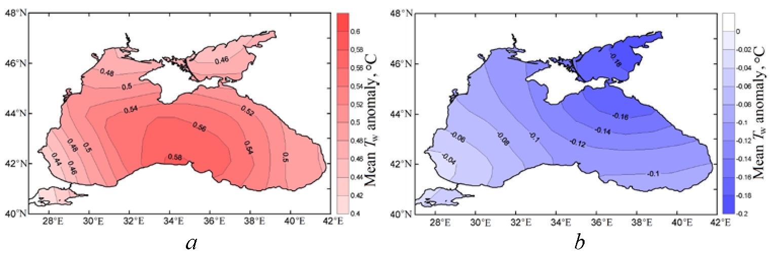 F i g. 10. Surface temperature anomaly of the Black Sea during the decades of negative (a) and positive (b) values of the NAO index