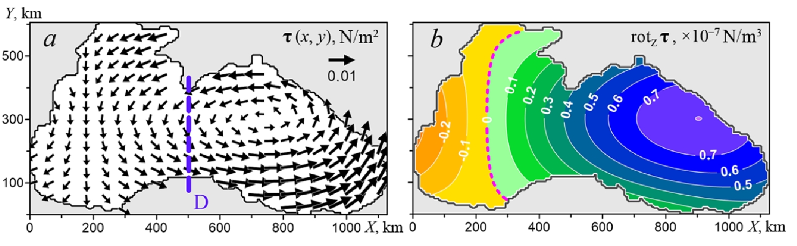 The wind effect was set by stationary field of tangential wind stress τ (x, y) with an area-variable vorticity (Fig. 1, a, b), while the average vorticity over the sea area was cyclonic and amounted to 0.3∙10–7 N/m3. The choice of stationary field τ is explained by the fact that in this case the numerical model reaches a statistically equilibrium regime quickly.
