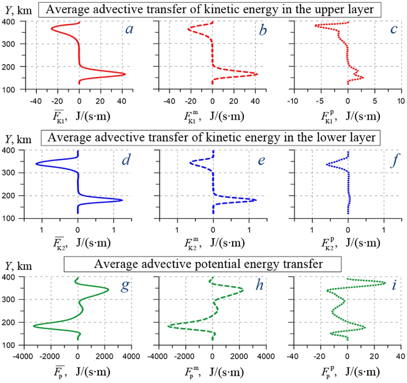 In the central part of section D (Fig. 4, i, between 200 and 300 km on the vertical scale) there is another maximum of advective flow, which determines the main contribution of ME to the total potential energy transfer, resulting in a total flow = 40 MJ/s directed to the west (Fig. 5, c).