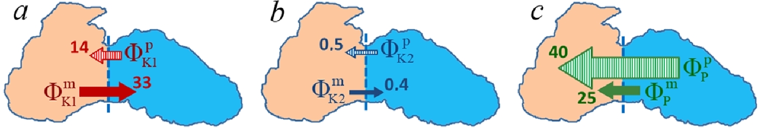 An important feature of the scheme presented, linking all its elements together, is the presence of the advective energy flows discussed above, directed from one part of the sea to the other (Fig. 5). On the one hand, it can be said that these advective flows compensate for differences in the size and direction of energy transitions in the western and eastern parts. On the other hand, these advective energy flows, being a consequence of the β-effect, are the main reason for the uneven distribution of energy transitions across the sea.