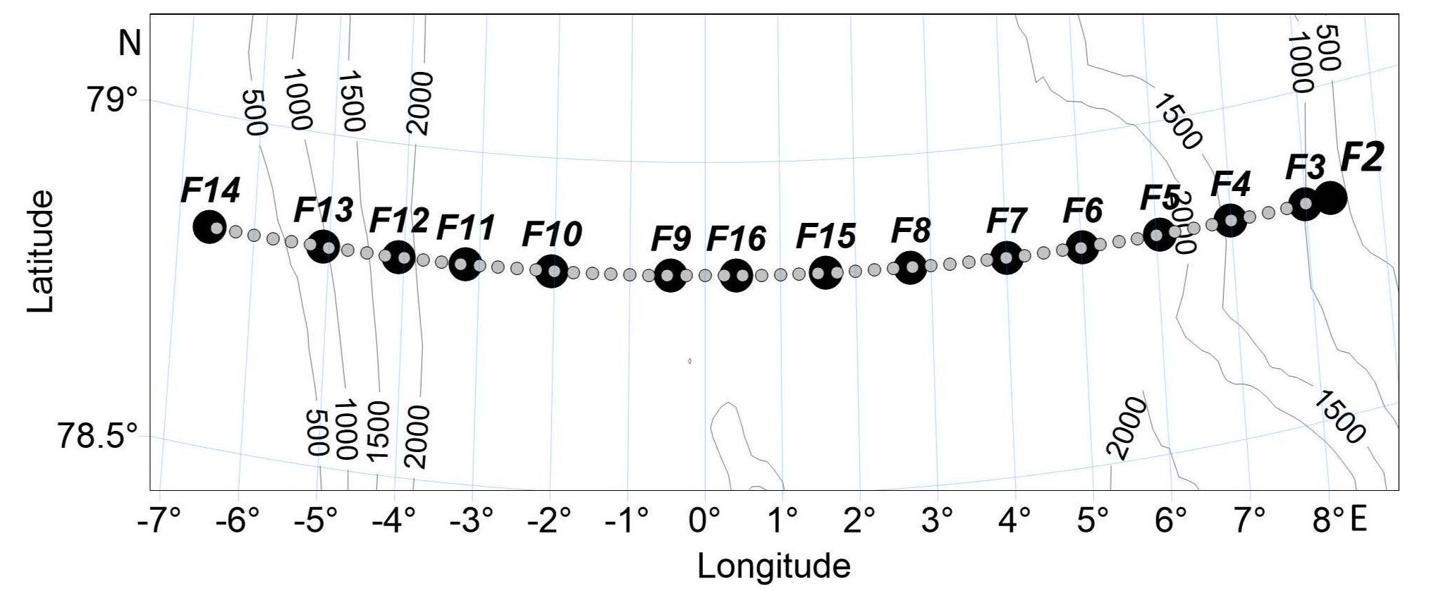 F17 mooring was excluded from further analysis due to its insufficiently long time series. F11–F14 moorings changed their position in 2002 from 79°N to 78.5°N to match the position of the AWI buoys.