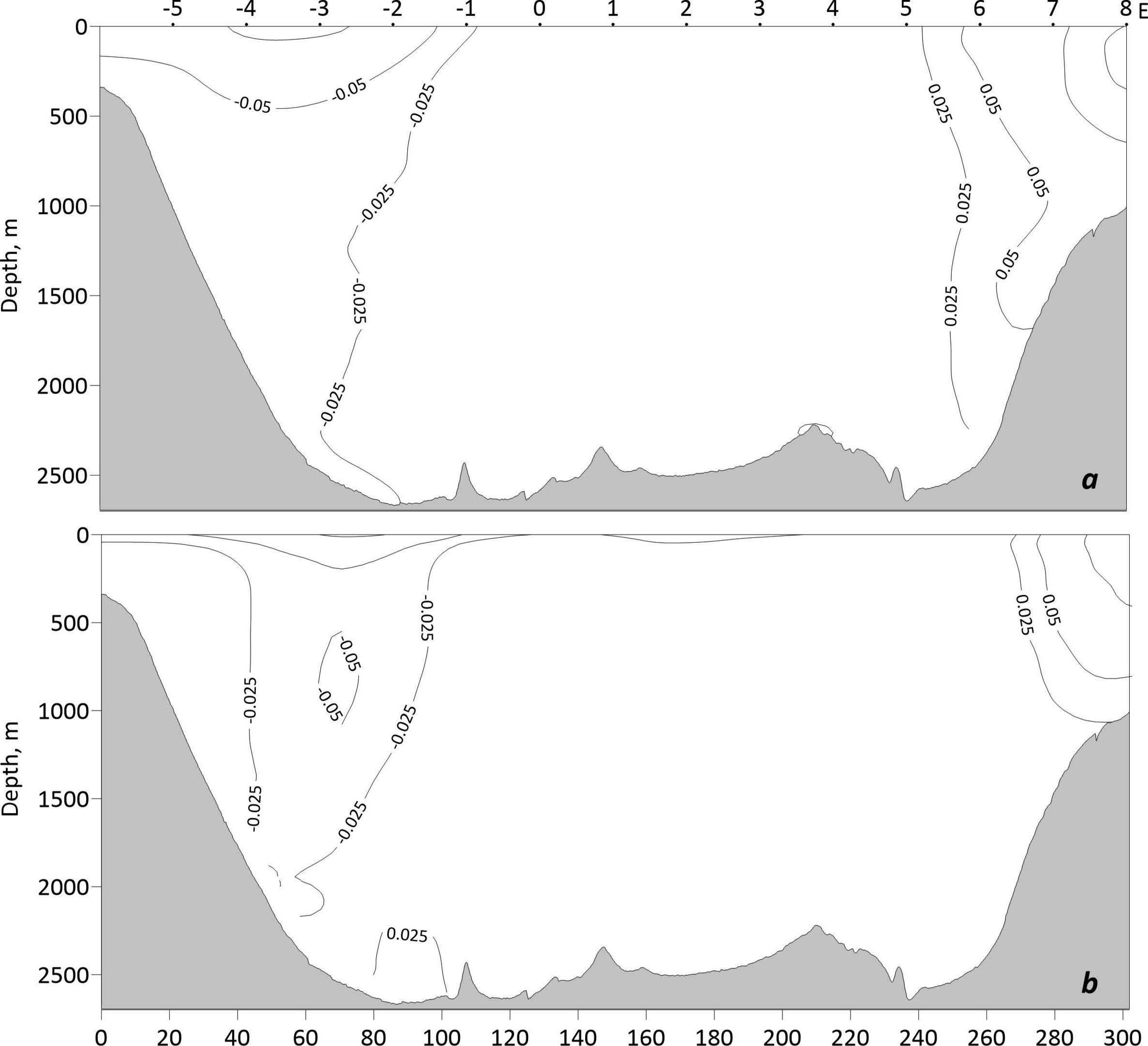 Figure 3 shows the annual values of meridional current velocities according to the mooring data (Fig. 3, a) and reanalysis (Fig. 3, b).
