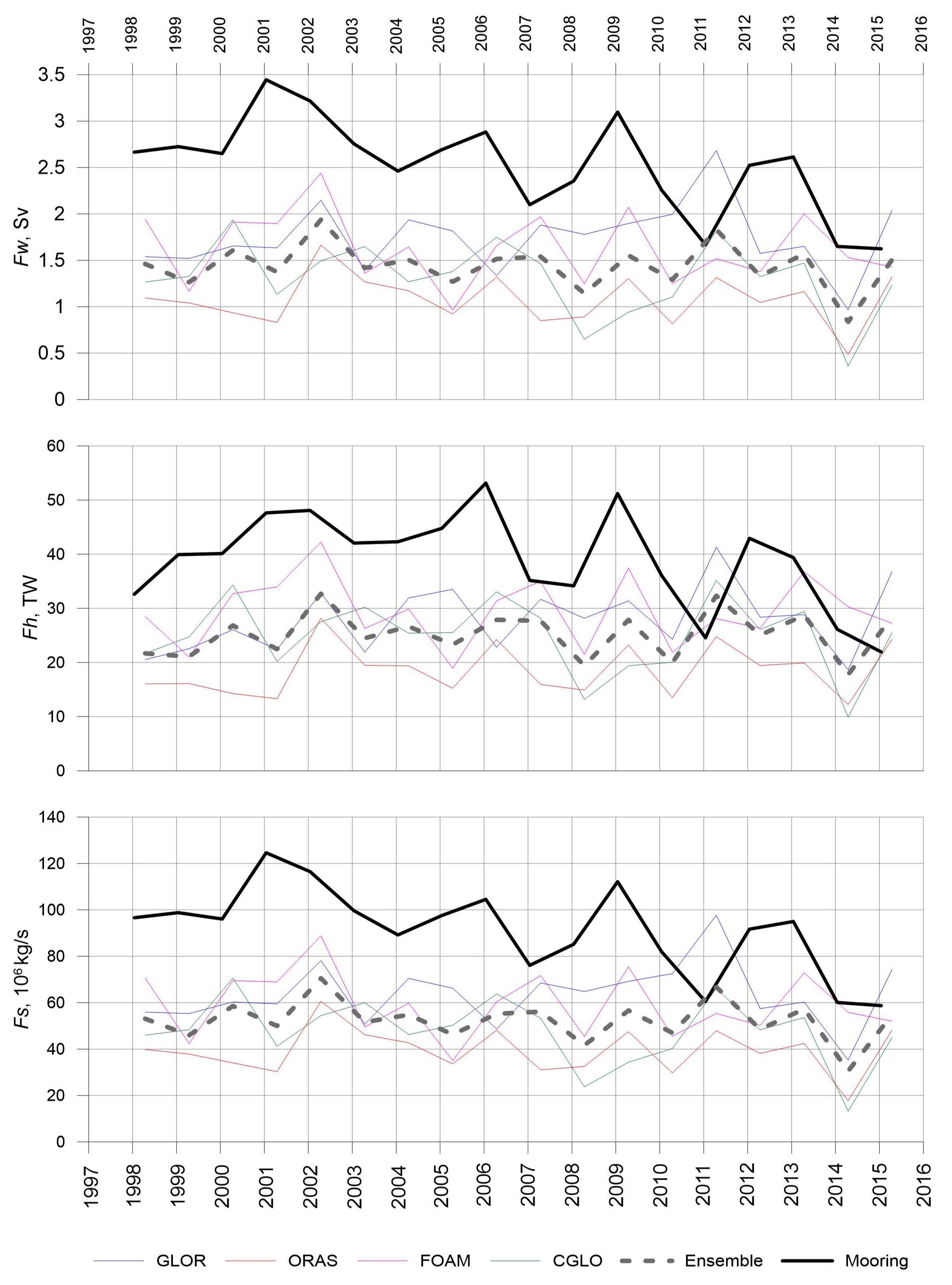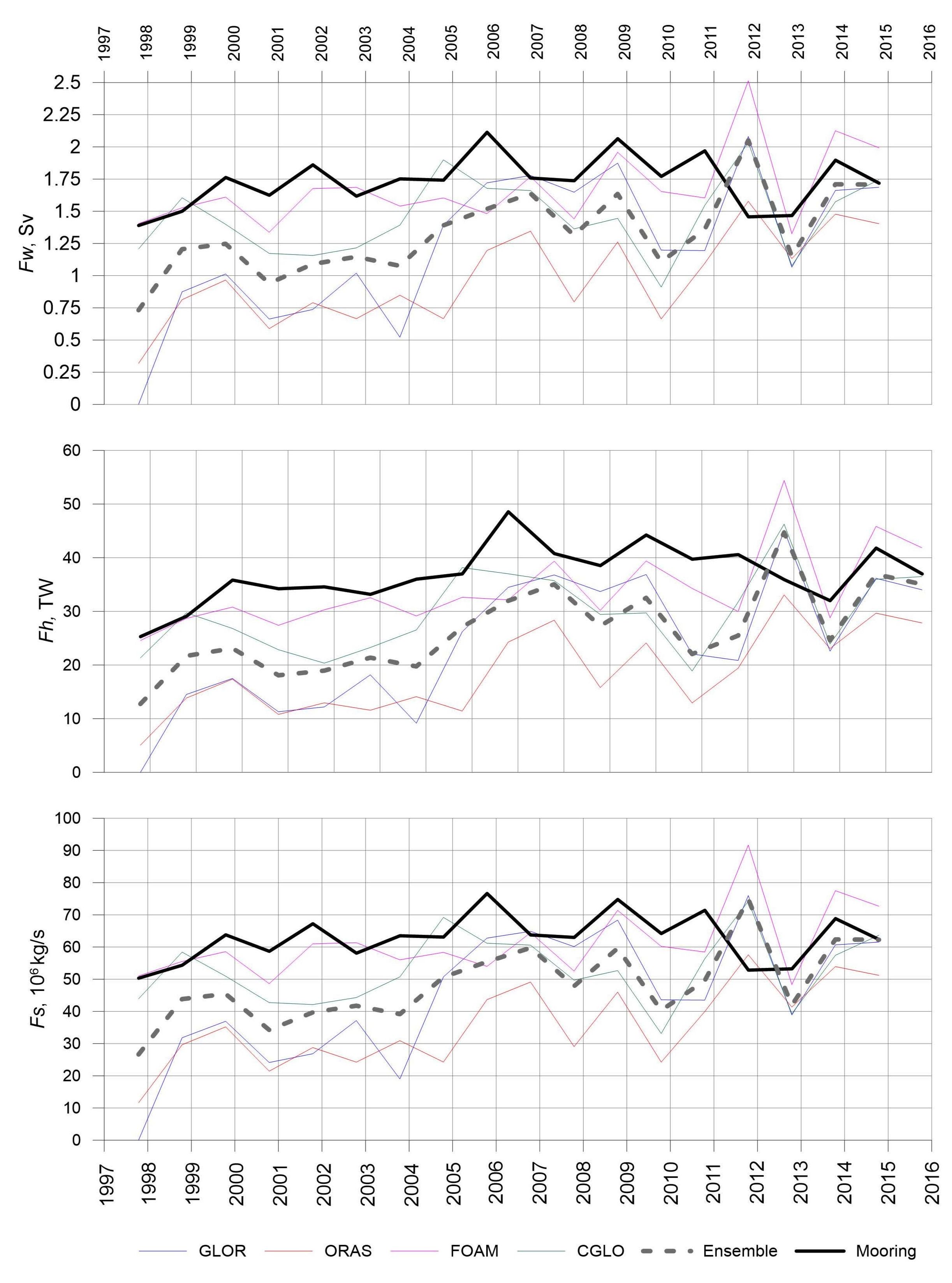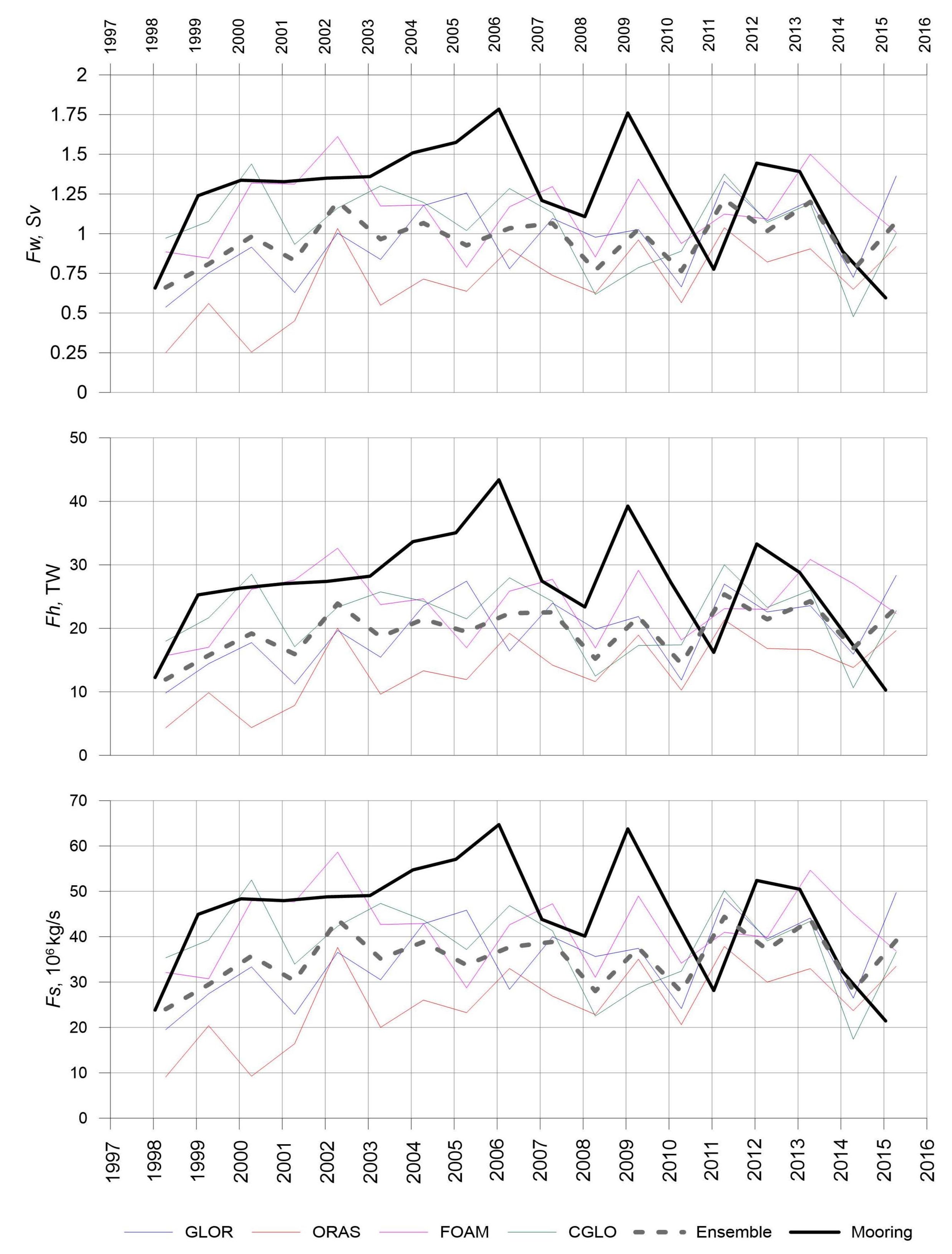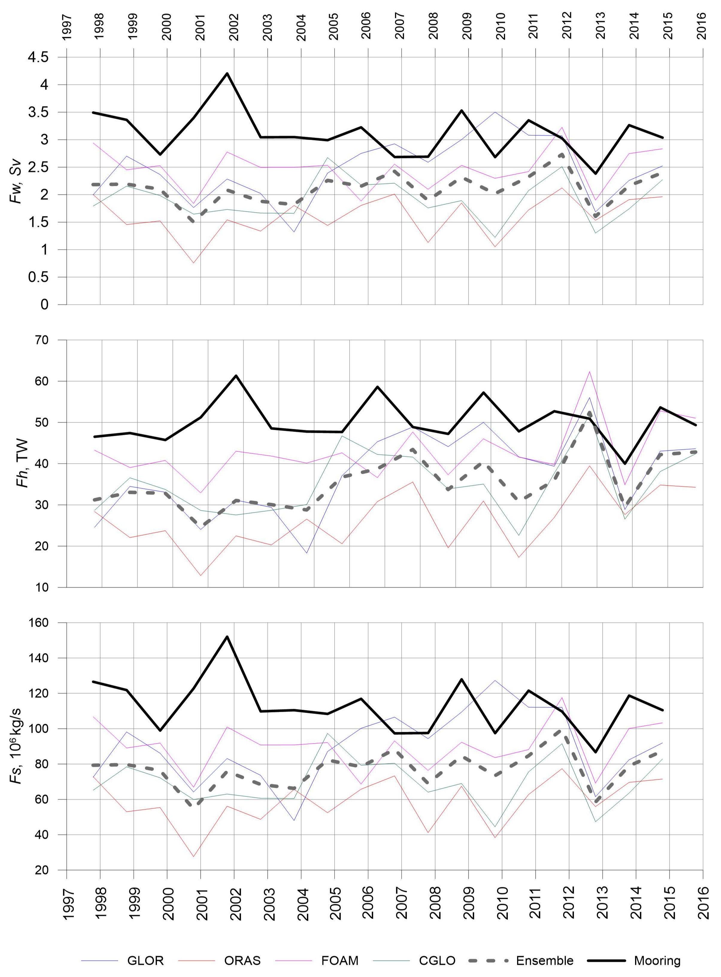 Additional analysis of heat and mass transport processes associated with Atlantic waters (T > 2 °C) showed significantly better results. It is revealed that the ensemble of models describes observation data variability the best. Talking about individual products, preference is given to the FOAM and CGLO reanalyses describing most of the mooring temporal variability.