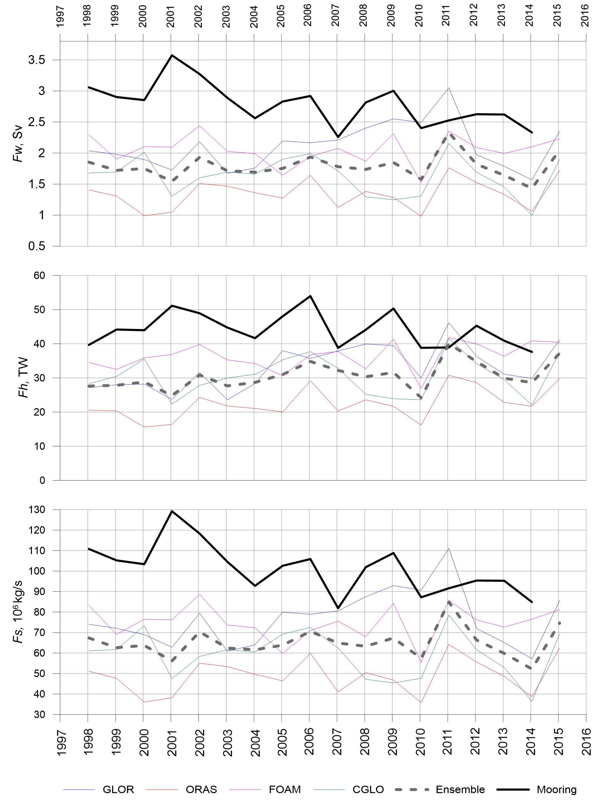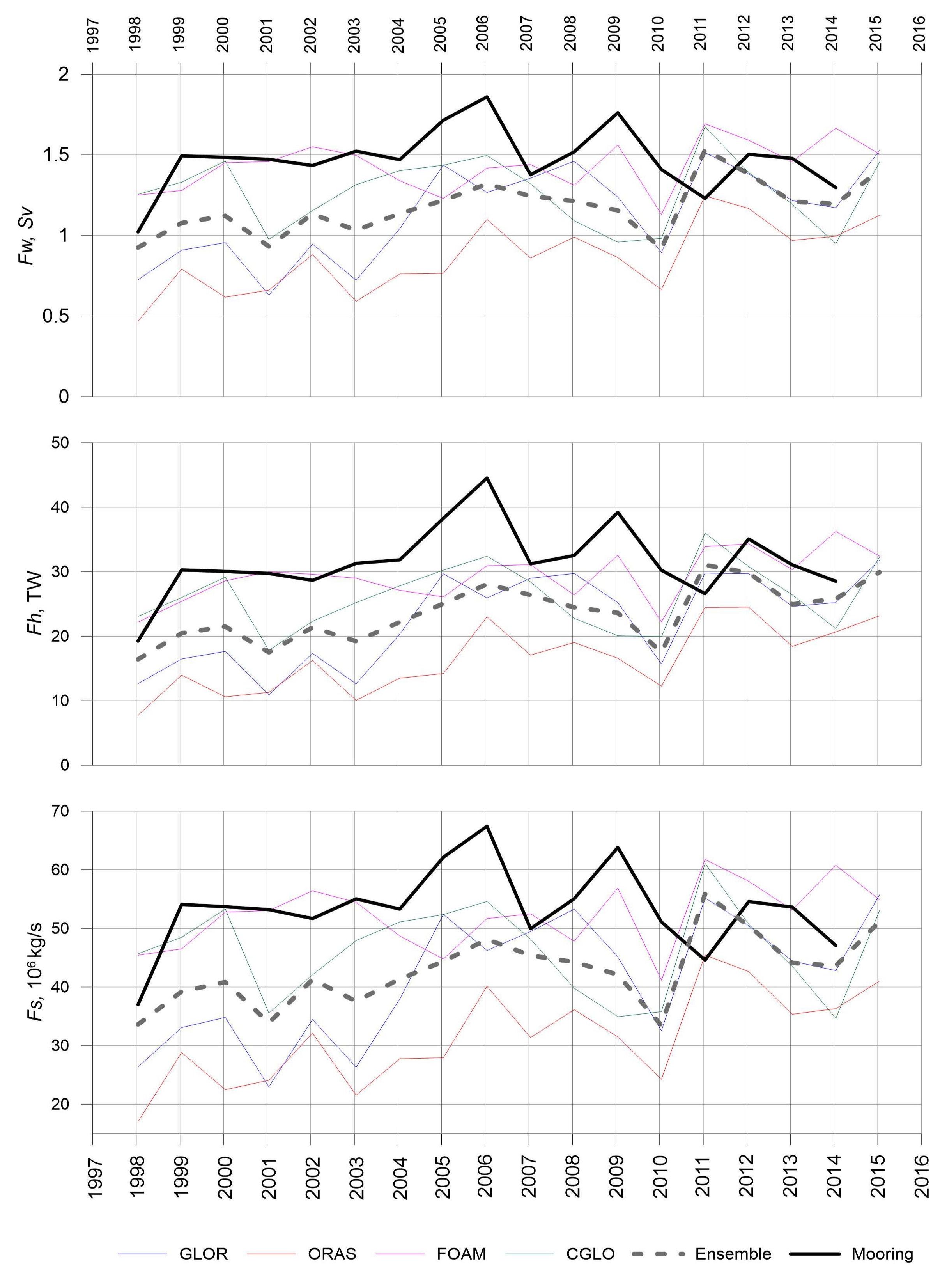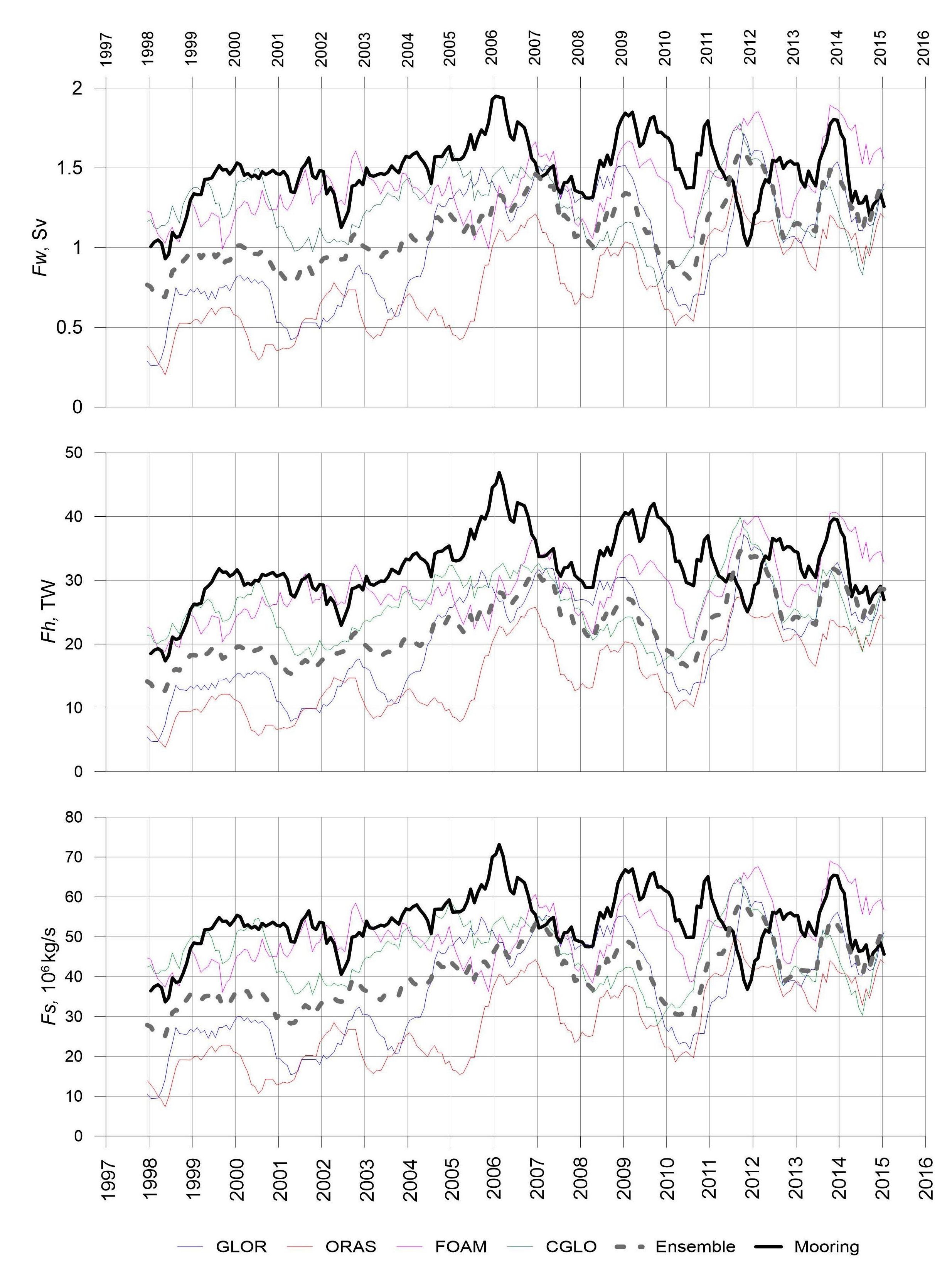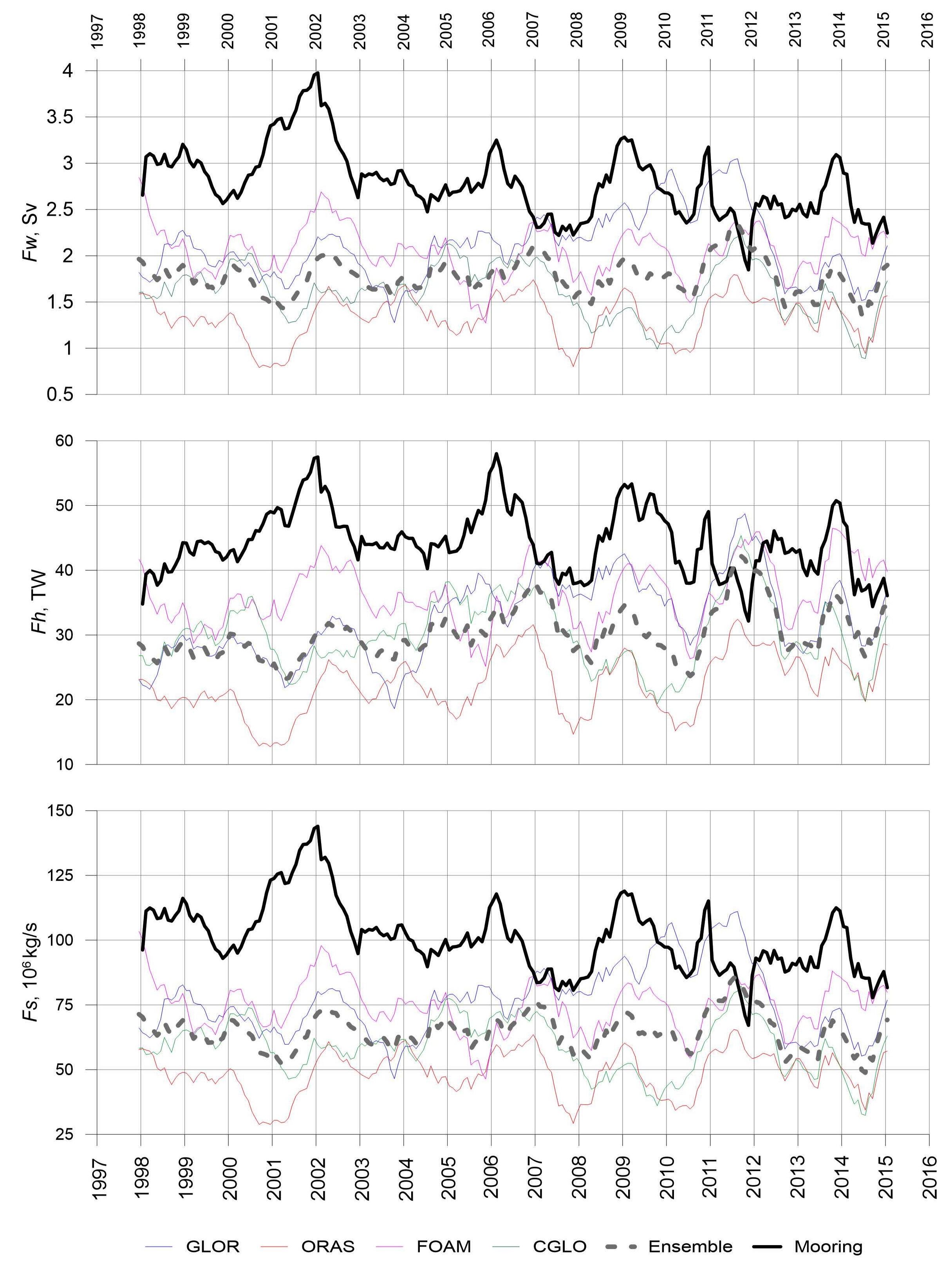 Additional analysis of heat and mass transport processes associated with Atlantic waters (T > 2 °C) showed significantly better results. It is revealed that the ensemble of models describes observation data variability the best. Talking about individual products, preference is given to the FOAM and CGLO reanalyses describing most of the mooring temporal variability.