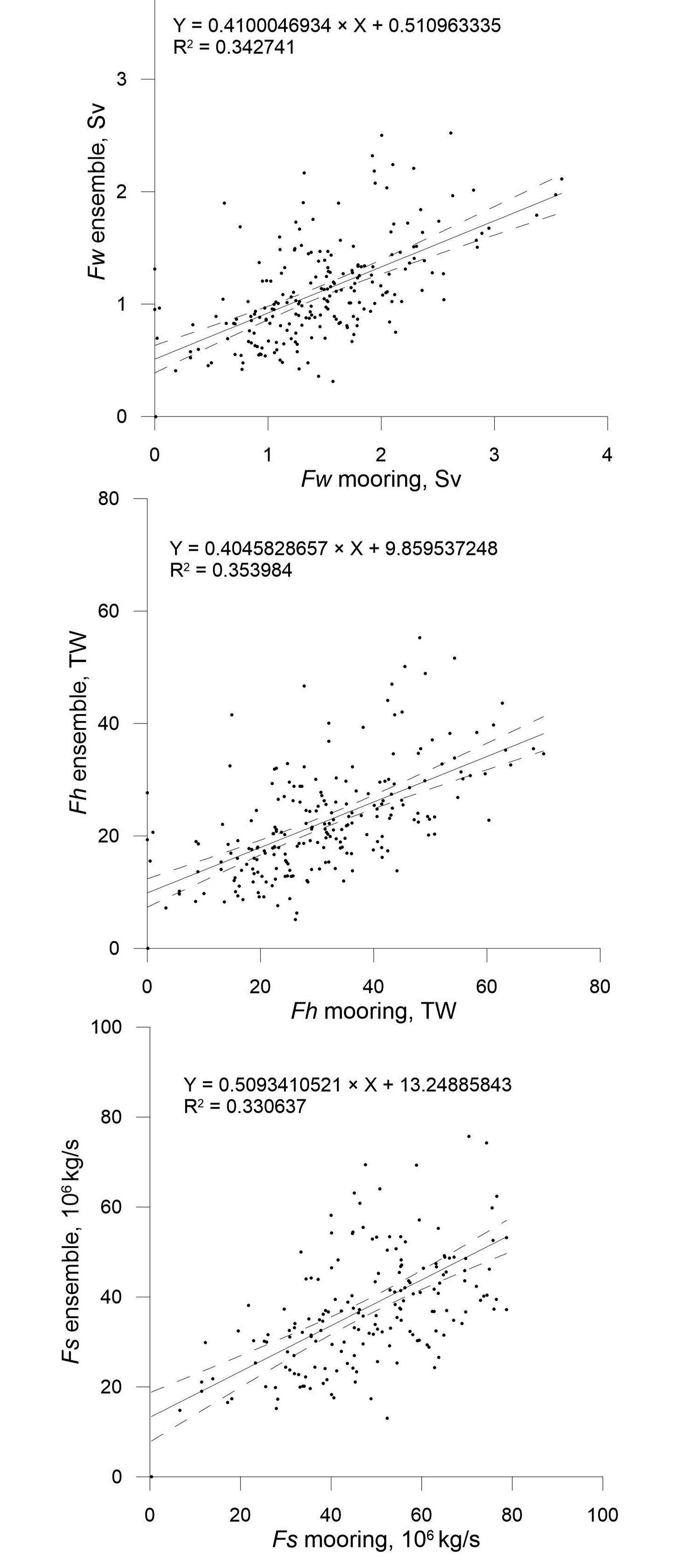 Figure 4 shows that the reanalysis data generally underestimate heat and mass transport value. Thus, the average value of volume transport, according to the mooring data, is higher than the ensemble average by more than 30% and its standard deviation is 50% higher. A similar picture is observed in heat and salt transport (Table 2).