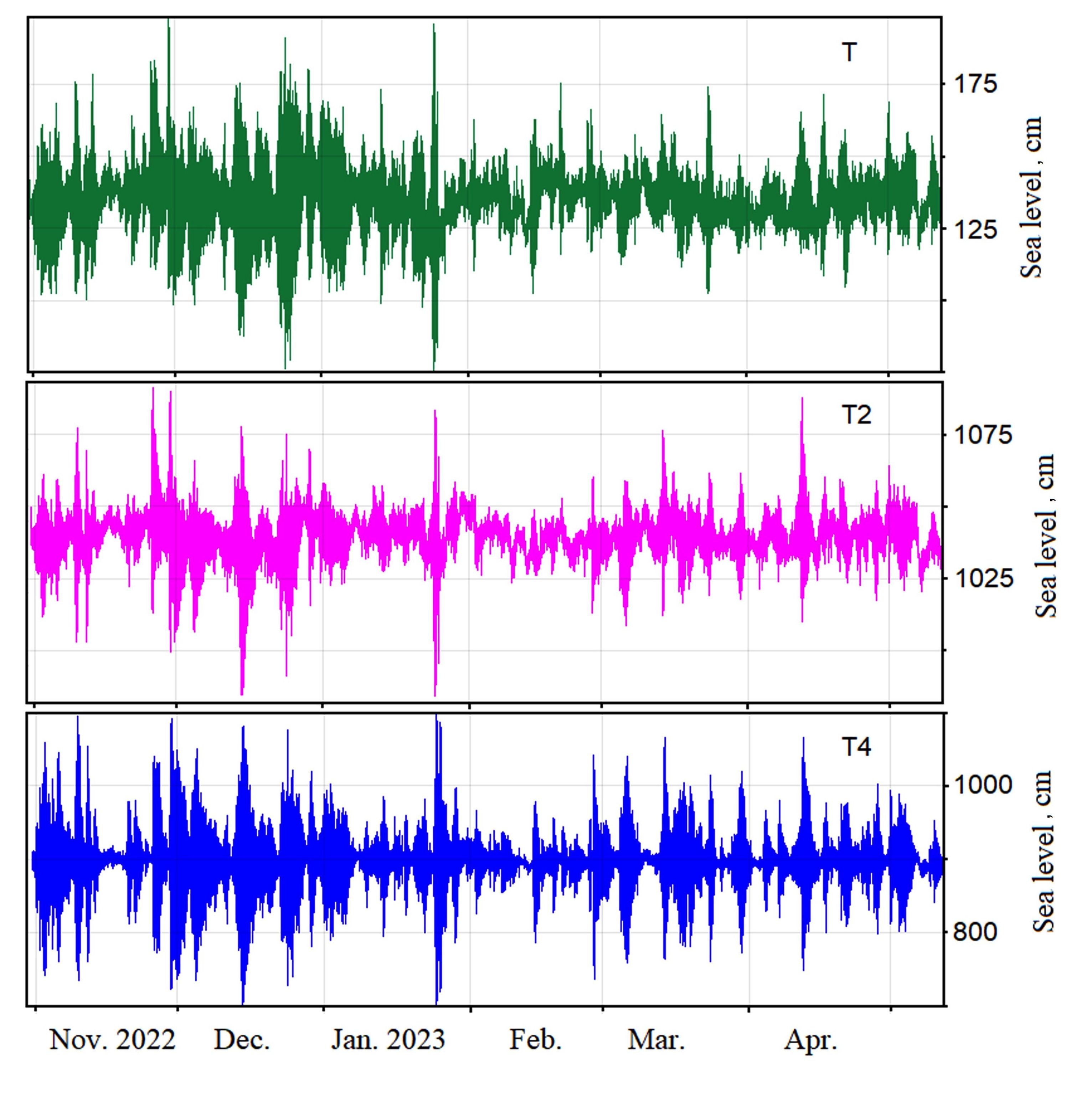 Sea level observations. Sea level observations were carried out from September 2022 to May 2023 using three autonomous ARW-14 K wave meters: T meter (serial number 152), T2 meter (serial number 142) and T4 meter (serial number 149) (Fig. 1). The fourth device was also installed in the sea at an isobath of 4 m opposite the inlet of Kholmsk-Severny Bay, but it turned out to be faulty. Accuracy of bottom hydrostatic pressure measuring, which was subsequently converted into sea level oscillations taking into account the attenuation of short waves with depth, is 0.06% of the full scale of measurement and the pressure resolution is equal to ±0.0003% of the full scale of measurement. Discreteness of sea level and temperature measurements is 1 s.